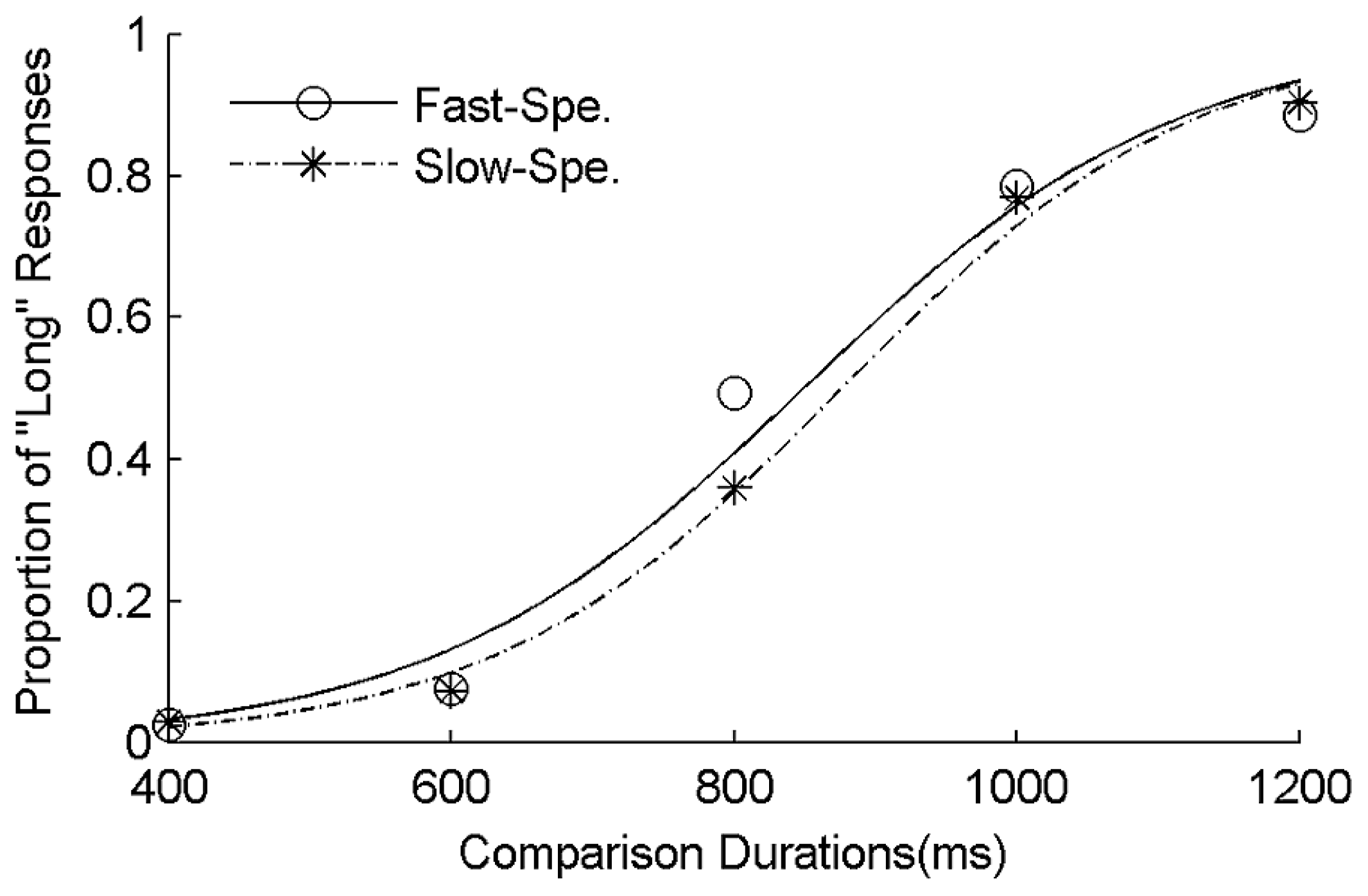 The proportions of “long” responses were calculated for each condition and each subject. This measure was then fitted by logistic functions against the comparison durations. A higher proportion of “long” responses indicate that participants are more frequent to judge the comparative duration as closer to the long standard duration. Figure 1 shows the average psychometric curves for the fast-speed word and slow-speed word condition, separately. The temporal bisection point (TBP) was the 50% point of the logistic function (Treutwein and Strasburger, 1999). A lower TBP means a longer perceived duration and a higher TBP means a shorter perceived duration. The just noticeable difference (JND) of the temporal bisection was the half difference in duration between the 25% and 75% points of the logistic function (Shi et al., 2008; Vroomen and Keetels, 2010). JND is the indicator of the sensitivity of the temporal bisection task. In addition, we measured the Weber fraction, calculated as the ratio of JND/TBP.