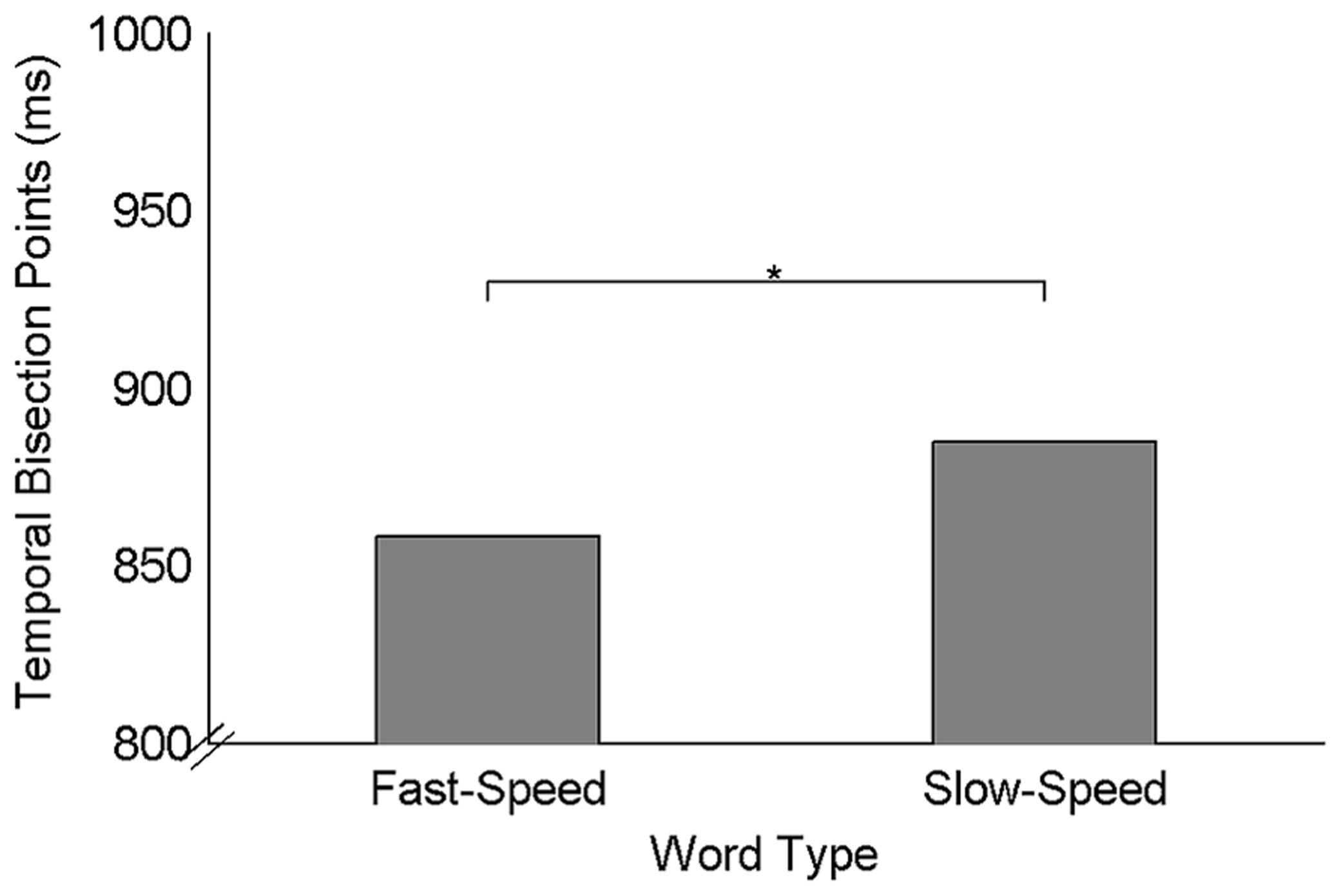 Mean temporal bisection points for two types of speed words. *p < 0.05.