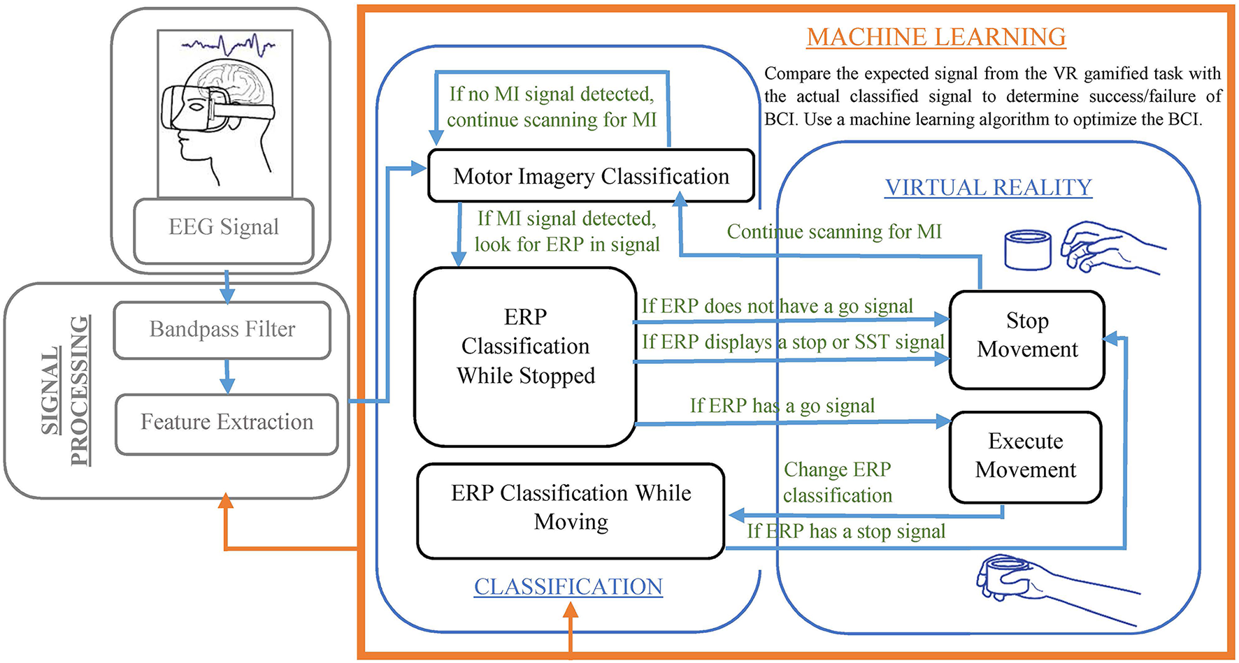 ERPs and MI can be combined in BCIs for movement using training for both the patient and the machine learning algorithm. The user initially sets the baseline signal processing characteristics and classifiers for the BCI by going through GNG and SST tasks in a VR environment that are disguised as games. These baseline characteristics are used to provide visual and metric feedback while collecting data on the patient's MI and ERPs. Once a sufficient amount of data is collected, a machine learning algorithm is used to optimize signal processing and classification. The classifier distinguishes between movements like reaching or grasping using MI, as well as determining whether the signal is inhibited or not using ERPs. By continuing to train, the user improves the ability of their BCI to successfully interpret their movement intentions and inhibition of movement. Continuing to use the algorithm to update the classifier will help the BCI to retain its accuracy over time, even with changes in the user's brain patterns.