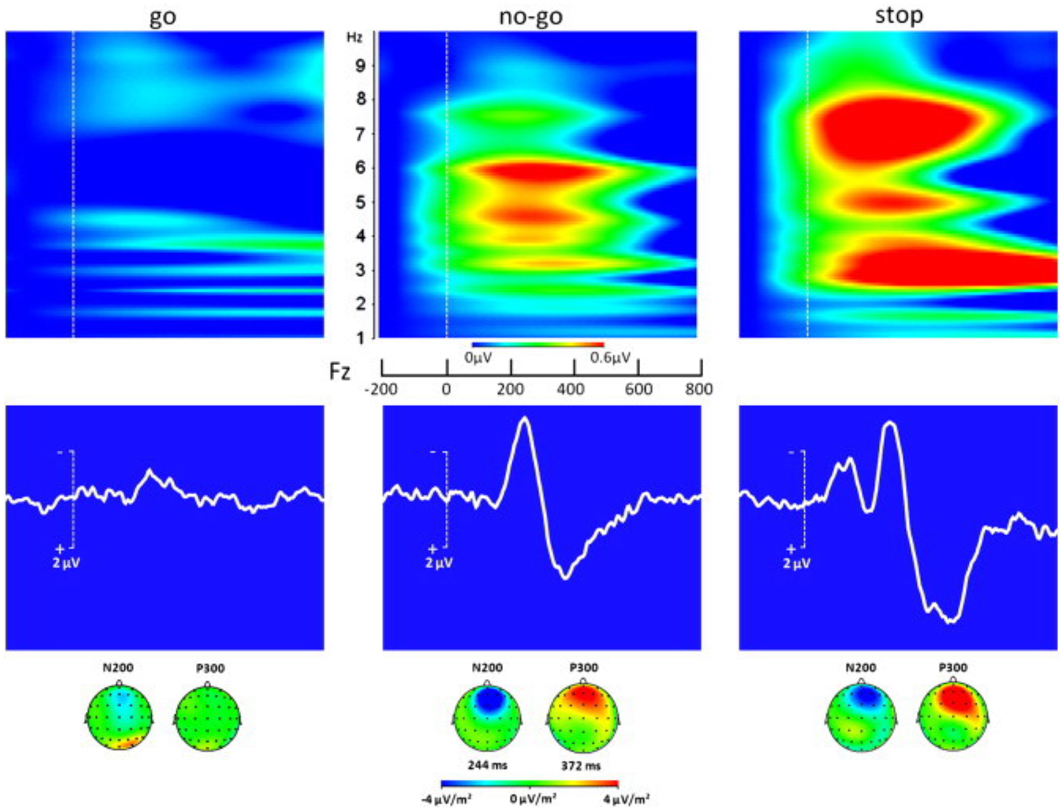 ERP responses in a subject performing go, no-go, and stop tasks. The middle row shows the ERPs; the top row shows the associated time-frequency decompositions; and the bottom row shows how the N200 and P300 potentials are distributed over the scalp (Adapted with permission from Huster et al., 2013).