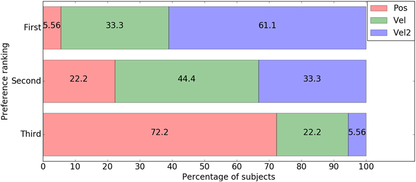Regarding the preference orders provided by the subjects (Figure 7), we can see that Pos mode was the most negatively evaluated, with more than two-thirds of them ranking it last, and only one ranking it first. Similarly, Vel2 mode was the most positively evaluated, with more than half of the subjects ranking it first, and only one ranking it last. Globally, the preference difference between Vel and Vel2 is less distinct than between Vel and Pos, but still clear enough: two-thirds of the subjects ranked Vel2 mode better than Vel mode.