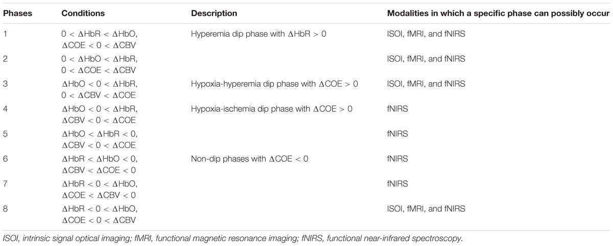 The ratio of ΔCOE to ΔCBV (i.e., ΔCOE/ΔCBV) defines the degree of oxygen exchange. Therefore, ΔCOE represents the oxygen exchange in the blood vessels and thus also the neuronal activities (Oka et al., 2015). ΔCOE > 0 indicates that deoxygenation is occurring in the capillaries as a result of oxygen consumption by the nerve cells and, therefore, represents hypoxia in the blood vessels. On the other hand, ΔCOE < 0 indicates that the oxygen-containing red blood cells are being supplied by the arteries and, thus, a high level of oxygenation in the blood vessels. Figure 3 shows the phase diagram and its decomposition into eight phases/regions. Table 4 summarizes the description and interpretations of these eight phases/regions. Phases 1 to 5 in Table 4 are the initial dip phases because they reflect an increase in either ΔHbR or ΔCOE. Therefore, an event-related vector residing in these regions is defined as an initial dip. The increases of ΔCBV and ΔHbR in Phases 1 and 2 (i.e., mostly observed in the fMRI and ISOI) are called the hyperemia dip phases (Malonek and Grinvald, 1996; Jones et al., 2001; Hu and Yacoub, 2012). Phases 3–5 are the hypoxic dip phases with a decrease in the ΔHbO. Phase 3 is called the hypoxic-hyperemia dip caused by the increase in the ΔCBV, whereas Phases 4 and 5 are categorized as the hypoxic-ischemia dip caused by the decrease in the ΔCBV. It is noted that Phases 1–3 occur in all three modalities (i.e., ISOI, fMRI, and fNIRS). ISOI and fMRI initial dip studies were mostly focused on the initial increase in the ΔHbR and ΔCBV (Sirotin et al., 2009). In these three phases (i.e., 1–3) both the ΔHbR and ΔCBV increase enabling the vector phase analysis to detect the ISOI and fMRI initial dips. However, in Phases 4 and 5, the ΔCBV is decreasing, which cannot be visualized/discussed in ISOI and fMRI (Sintsov et al., 2017). As fNIRS simultaneously measured ΔHbO and ΔHbR, the decrease in ΔCBV can possibly be detected, which enables fNIRS to detect five types of initial dips. Out of these five initial dip phases, the hypoxic dip phases (i.e., Phases 3–5, in which ΔCOE > 0) frequently occurred in the fNIRS signals (Sano et al., 2013; Zafar and Hong, 2017). Phases 3–5 indicate a hypoxic change in the blood vessels, thereby representing deoxygenation in the capillaries. Both ΔHbR and ΔCOE decrease in Phases 6–8, and these are called non-dip phases. In comparison to the non-dip phases, neuroactivation in the initial dip phases is considered higher (Yoshino and Kato, 2012).