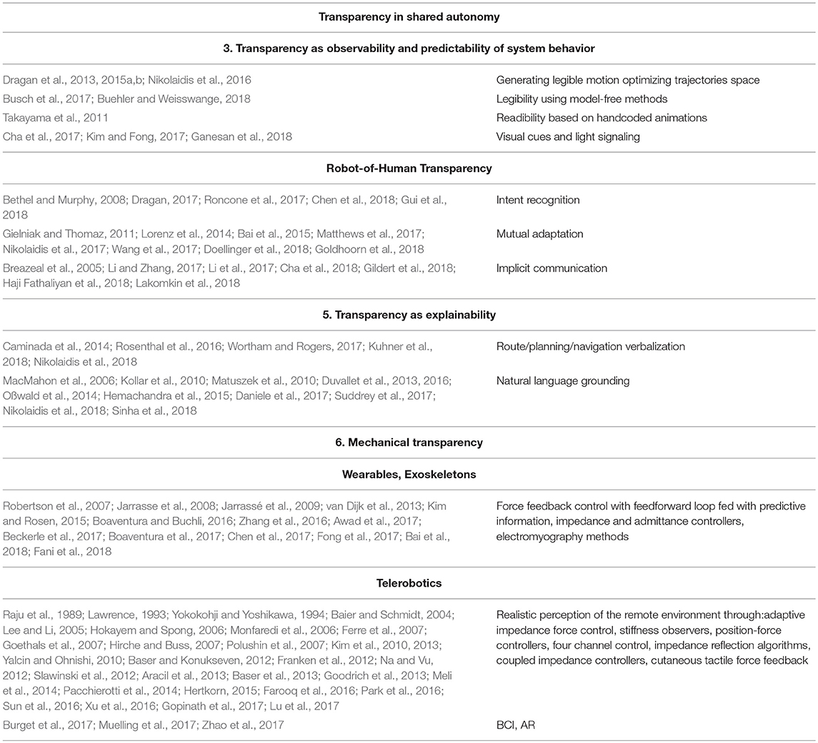 It can be observed that algorithmic approaches to establish and improve transparency are well developed, mature, and numerous in mechanical transparency and haptic interfaces. On the other hand, algorithms to establish transparency in the sense of observability, predictability, legibility, or explainability, or for other types of interfaces like brain computer interfaces, are not so numerous and have only been recently developed. Table 2 clusters a relevant selection of these algorithmic approaches.