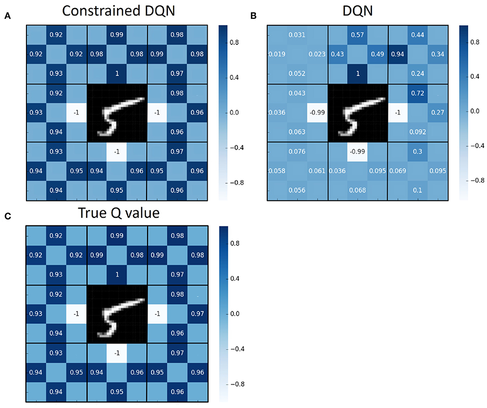 Figure 4. Comparison of values of the Q function for each state and action pair on the MNIST maze task. (A) Average Q value obtained by Constrained DQN after 50,000 training steps (not training episodes). (B) Average Q value obtained by DQN. (C) True Q value. The values of up, down, left, and right at each state are filled at the corresponding sides of the number position of Figure 1.