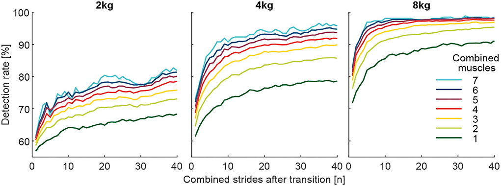 Figure 8. Detection rate with respect to the number of involved muscles from the 127 possible muscle combinations analyzed. Each graph includes 40 strides in alternating order from the left (20 strides) and right (20 strides) limbs. For example, the dark green curve is the mean of the seven individual muscle analyses, and the light green is the mean of the 21 possible two-muscles combinations. Furthermore, all combinations with 3 (yellow, 35 combinations), 4 (red, 35 combinations), 5 (purple, 21 combinations), 6 (blue, 7 combinations), and 7 (cyan, 1 combinations) involved muscles were analyzed.