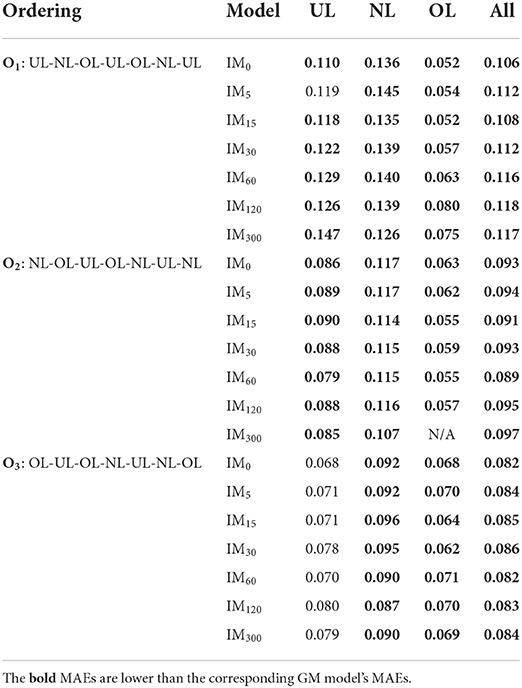 Similar to the generalized prediction methodology, the predictive power of the individualized performance prediction model was evaluated by developing the seven prediction model variants: IM0, IM5, IM15, IM30, IM60, IM120, and IM300. The MAE for each individualized model variant by workload ordering and workload condition are provided in Table 3, where bold values represent an increase in accuracy over the corresponding GM model. Results for O2's OL condition cannot be presented for the IM300 variant, because that condition only occurs at the beginning of the second half of the evaluation's second day. Thus, predicting the performance 300 s into the future caused the IM300 model variant to avoid the OL condition. Overall, there are no clear trends in the table. However, the IM model variants on average had an 0.02 decrease in MAE from the corresponding GM MAEs (Table 1), demonstrating that individual specific information improved model performance. There was an average increase in MAE of 0.005 for O3's UL condition. This marginal increase was unexpected but does not substantially affect the overall prediction results.