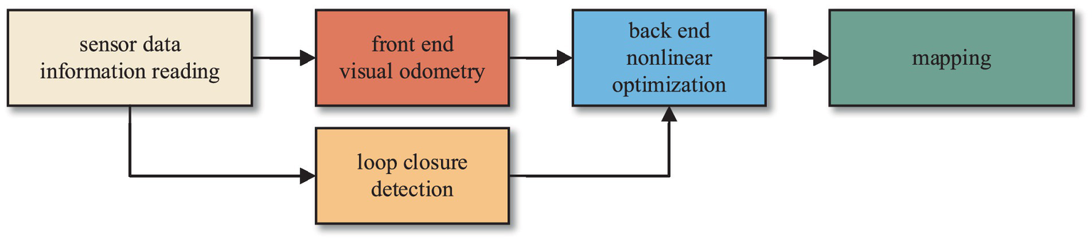 Firstly, feature points are extracted from the images captured by the camera. Subsequently, feature matching is performed on the two consecutive images to eliminate mismatched feature points. Then, estimation of pose changes for the mobile robot at the current moment is conducted based on these adjacent images. The pose changes estimated by the visual odometry typically represent short-term variations and are prone to cumulative errors as the robot moves. Therefore, closed-loop detection and back-end optimization are employed in the SLAM system to reduce these cumulative errors.