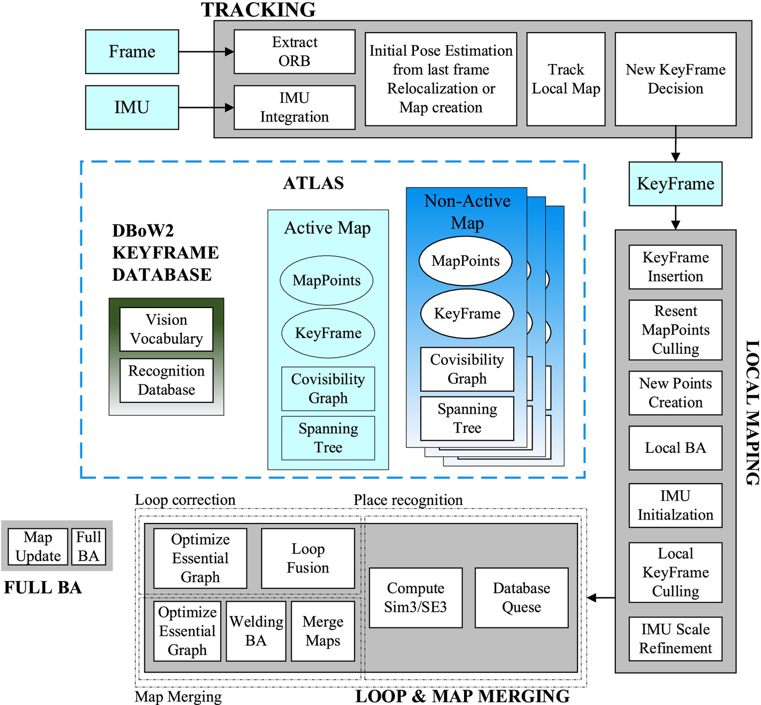 Threads and structure diagram of ORB-SLAM3 system.