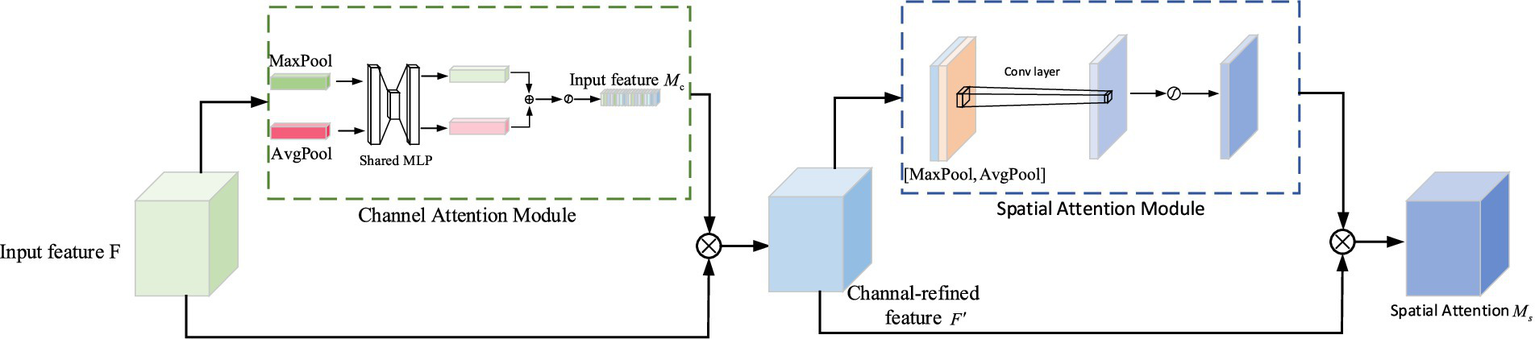 Where: F is the input feature map; is the feature map output after passing through the channel attention structure; represents the result of the multiplication of and F; represents the feature map output after the CBAM attention mechanism; AvgPool represents the average pooling operation; MaxPool represents the maximum pooling operation; MLP represents multi-layer perceptron (fully connected layer); is the Sigmoid activation function.