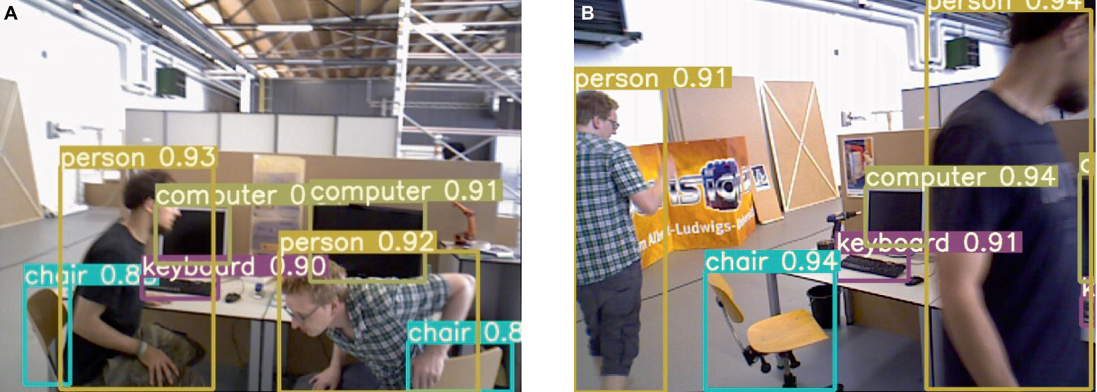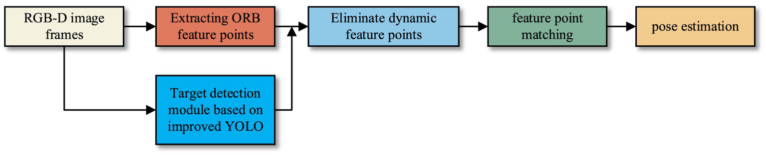 Therefore, those deep learning approaches have been introduced into visual SLAM in recent years. For example, to mitigate the impact of dynamic objects on SLAM, Yu et al. (2018) incorporated semantic segmentation and optical flow techniques into ORB-SLAM2, proposing a DS-SLAM algorithm to alleviate the influence of moving individuals in complex environments. Additionally, they introduced the construction of a semantic octree map to enhance positioning and mapping accuracy. However, it should be noted that semantic segmentation entails significant computational time, hindering real-time performance and potentially leading to feature tracking failures due to insufficient feature points post-dynamic removal. Bescos et al. (2018) pro-posed the DynaSLAM algorithm, which incorporates dynamic target detection and background restoration functions into traditional ORB-SLAM. Additionally, Mask R-CNN (He et al., 2017) is utilized for instance segmentation of dynamic objects. This algorithm improves the accuracy of pose estimation localization; however, it also increases corresponding computational time, rendering it unsuitable for real-time SLAM applications. Zhong et al. (2018) developed the Detect-SLAM system by integrating the SSD (Single Shot Multi Box Detector) target detection network with a SLAM system to identify objects in image sequences using a pre-trained target detection network. Dynamic feature points are removed during the ORB feature extraction stage to significantly enhance the accuracy and robustness of SLAM in dynamic environments. Ran et al. (2021) introduced RS-SLAM as a robust semantic RGB-D SLAM system that improves region of interested extraction accuracy by incorporating context information based on Bayesian update to modify segmentation results. Furthermore, it is capable of constructing a clean static semantic OctoMap in a dynamic environment. Some experts and scholars have done some research in the field of YOLO and SLAM, such as, Tian et al. (2022) proposed a SLAM system based on ORB-SLAM2 for dynamic environment, Based on RGB-D camera, the system uses YOLOX-S to detect dynamic objects and combines depth information to filter dynamic points. Tang et al. (2023) introduced a visual SLAM framework designed for dynamic indoor environments. Cong et al. (2024) proposed a dynamic visual SLAM (SEG-SLAM) system based on the orientated FAST and rotated BRIEF (ORB)-SLAM3 framework and you only look once (YOLO)v5 deep-learning method. You et al. (2022) proposed a novel multimodal semantic SLAM system (MISD-SLAM), which removes the dynamic objects in the environments and reconstructs the static background with semantic information.