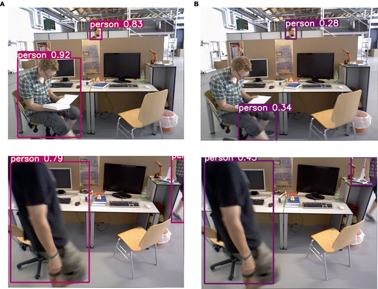 The improved lightweight YOLOv5s network is employed for target detection, and the resulting detection performance is illustrated in Figure 7. As depicted, the category of the detection result is presented within the figure. In dynamic scenes, humans are considered as high-mobility targets; thus, the target detection network is configured exclusively for human recognition. The comparison test results before and after adding K-means clustering are shown in Figure 8, (a) listed as the test results after adding K-means, and (b) listed as the test results without adding K-means. It can be observed that on the one hand, the large target can be completely detected, and on the other hand, it still has high confidence when only the exposed head, arm or leg parts of the human body are visible.