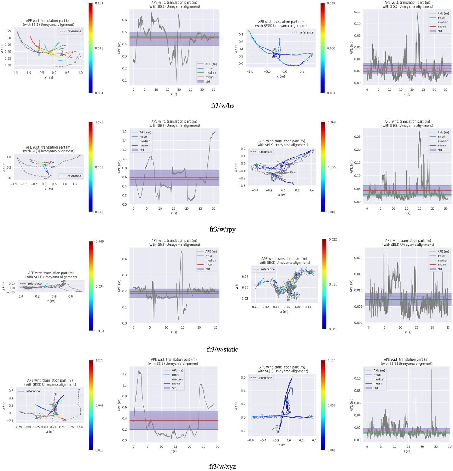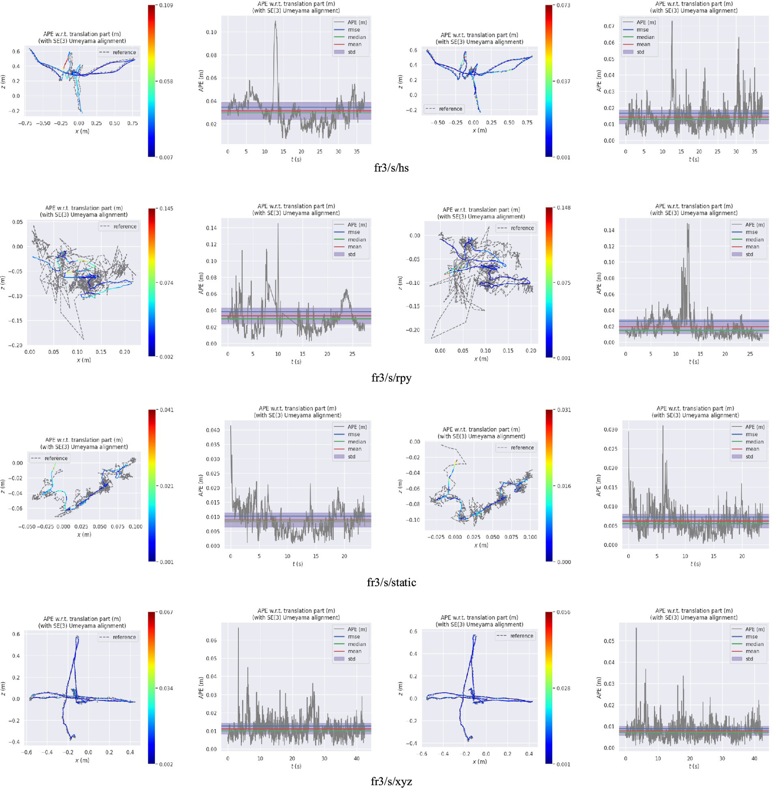 Absolute Trajectory Error (ATE) is commonly employed to evaluate the positioning accuracy of the SLAM systems. In our pose estimation error analysis experiment, we utilize the evo tool to evaluate and compare the camera pose CameraTrajectory.txt estimated by the ORB-SLAM system with the true pose groundtruth.txt given by the dataset. The ATE enables us to quantify the disparity between the true and estimated values of the camera pose, thereby assessing global consistency of the trajectory. We compute the root mean square error (RMSE), median (Median), mean (Mean), and standard deviation (Std) as evaluation metrics for quantifying errors.