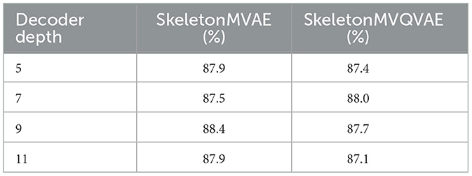 We further conduct the ablation study on different decoder depths (i.e., the number of STTFormer blocks used and a full connection layer). The decoder depths are set to 5, 7, 9, and 11 layers. The results are shown in Table 7. Too deep or shallow depths both reduce the fine-tuning accuracy. Considering the fine-tuning accuracy and model parameters, we set the decoder depth of SkeletonMVAE to 9 layers, and the decoder depth of SkeletonMVQVAE to 7 layers.