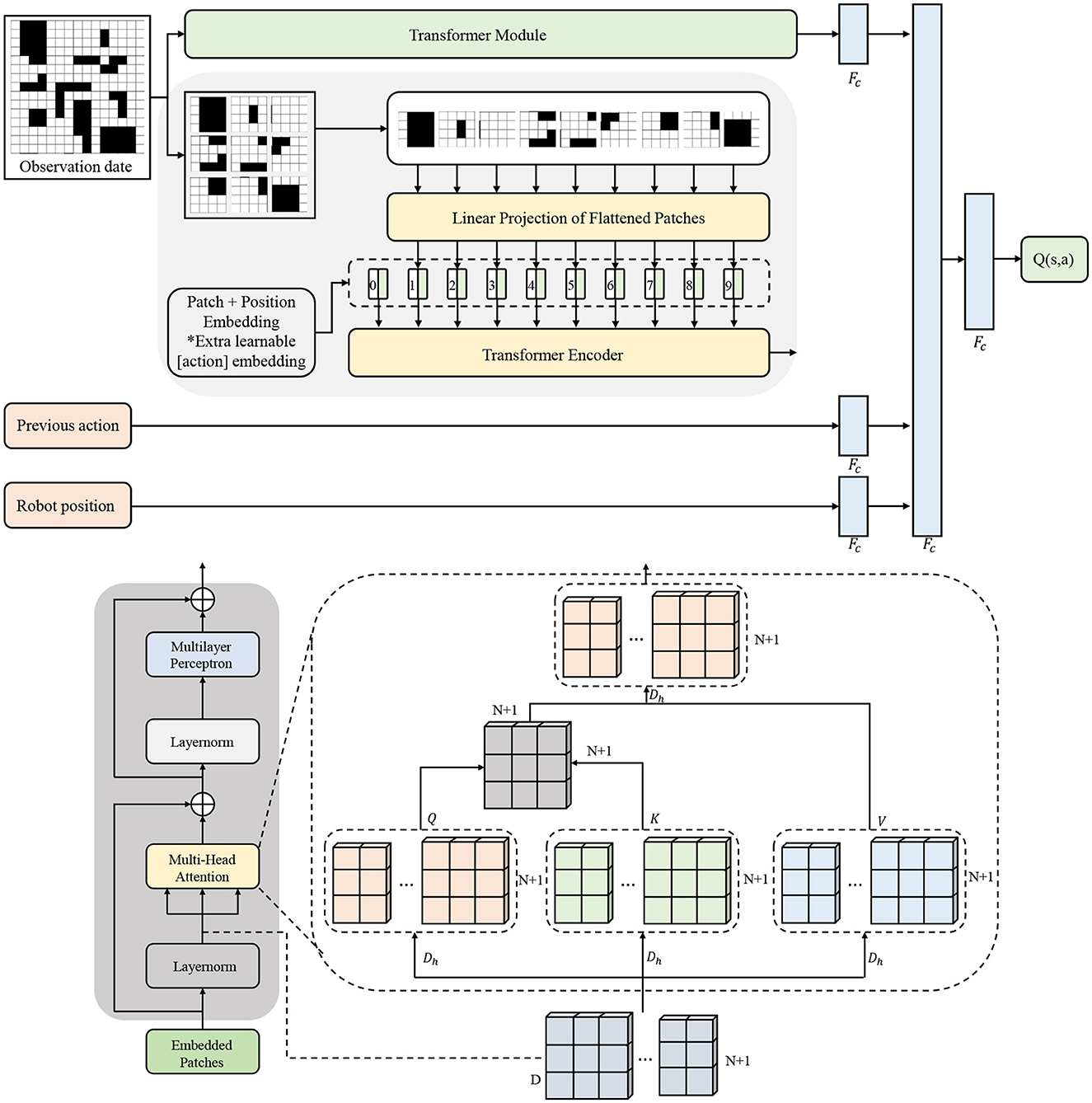 As illustrated in Figure 2, our architecture processes multimodal inputs through the Transformer module to generate embedded patches, which are then fed into the modified Q-network. The patch + position embedding corresponds to our spatiotemporal feature integration, while the multi-head attention mechanism enables selective focus on critical obstacles. The final Q(s, a) output directly maps to discrete navigation actions.