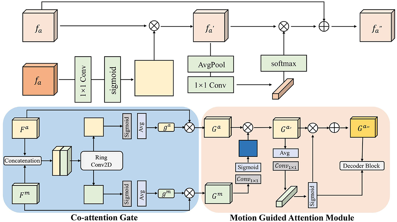 Figure 3 illustrates the detailed architecture of our Spatiotemporal Attention (SPA) mechanism, which consists of three main components: Co-attention Gate, Motion Guided Attention Module, and Decoder Block. The Co-attention Gate takes feature maps Fa and Fm as inputs, where Fa represents appearance features and Fm denotes motion features extracted from consecutive frames. The gate mechanism uses average pooling and 1 × 1 convolutions followed by sigmoid activation to generate attention weights ga and gm, which modulate the importance of appearance and motion information respectively. The Motion Guided Attention Module further refines these features through ring convolution operations and sigmoid gating to produce enhanced spatial-temporal representations Ga and Gm. Finally, the Decoder Block integrates these multi-scale features and outputs the final attended representation fa* that captures both spatial dependencies and temporal dynamics essential for obstacle avoidance decision-making.