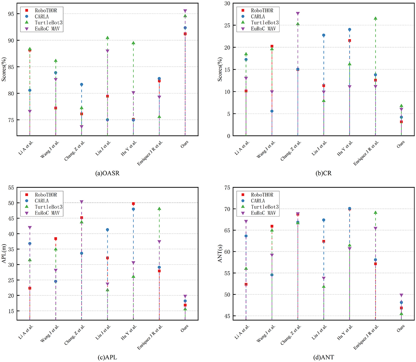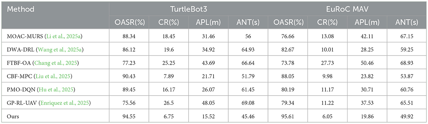 To comprehensively verify the effectiveness of the proposed end-to-end robot intelligent obstacle avoidance method based on deep reinforcement learning and a spatiotemporal Transformer architecture, this section systematically analyzes and compares the experimental results on four different types of datasets (RoboTHOR, CARLA, TurtleBot3, EuRoC MAV). We evaluate the model's performance under multi-scene and multi-task conditions from four key metrics: obstacle avoidance success rate (OASR), collision rate (CR), average path length (APL), and average navigation time (ANT). Particular emphasis is placed on analyzing the model's obstacle avoidance robustness, path planning efficiency, and real-time control capability in complex dynamic environments. Additionally, comparisons with various representative baseline models are conducted to highlight the advantages of the proposed method in global modeling, spatiotemporal feature extraction, and policy optimization.