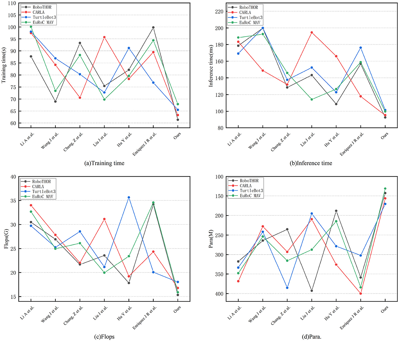 As shown in Table 4, the proposed method consistently outperforms all comparison methods across all metrics, reflecting a comprehensively optimized approach. On the TurtleBot3 dataset, the training time (65.53 s) is about 10% shorter than the next-best method (Liu et al., 72.76 s), inference time (101.46 milliseconds) is 17% lower than the best competing method (Hu et al., 122.79 milliseconds), and both GFLOPs (18.03G) and parameter count (170.59 M) are the lowest, demonstrating higher computational efficiency and a higher degree of lightweight design. On the EuRoC MAV dataset, the proposed method again maintains its lead, with the shortest training time (67.89 s), inference time (99.83 milliseconds), and the lowest GFLOPs (15.89 G) and parameter count (131.02 M), reducing overhead by 20–50% and 20–60%, respectively, compared to other methods. Notably, certain methods like Enriquez et al. have parameter counts as high as 384.12 M, yet their inference time (158.77 ms) remains significantly inferior to the proposed method, highlighting the efficiency of the model's structural optimization. Figure 6 presents a comparative visualization of the training metrics for each model in the four datasets. Calculating efficiency relationships and resource utilization patterns is important for practical deployment considerations. We considered the trade-off between efficiency and performance, achieving better results while reducing computational overhead. In terms of scalability across datasets, even with increased environmental complexity, consistent efficiency improvements can be maintained. We highlighted the relationship between model parameters, floating point operations (FLOPs), and actual performance improvements.