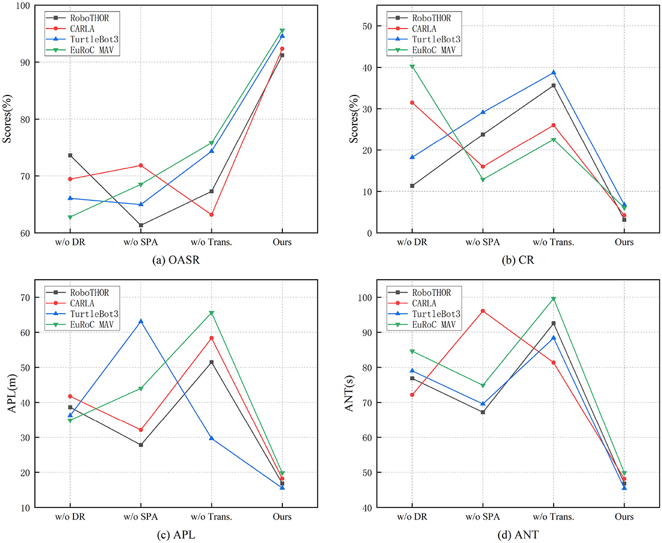 In the CARLA urban scene, the full model maintains its lead with a 92.35% OASR and 4.2% CR. Removing the Transformer drops OASR to 63.17%, increases CR to 26.05%, and significantly raises both APL (58.36 meters) and ANT (81.37 s), showing the critical importance of the Transformer in complex, dynamic, multi-object environments. Removing DR or SPA also results in noticeable performance declines, proving their indispensable roles in policy optimization and spatiotemporal feature extraction.