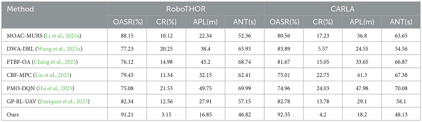 As shown in Table 1, in the RoboTHOR environment, the proposed method achieves an OASR of 91.21%, significantly higher than the best-performing comparison method (MOAC-MURS, 88.15%) and over 16 percentage points better than the lowest value (Hu et al., 75.08%). Meanwhile, the CR of the proposed method is only 3.15%, much lower than other methods (e.g., DWA-DRL. 20.25%, PMO-DQN. 21.53%), demonstrating strong policy robustness and safety. In terms of path efficiency, the APL is only 16.85 meters, superior to all comparison models, indicating that the model can seek more optimal strategies while ensuring safety. The proposed method also excels in ANT, requiring only 46.82 s to complete a task, significantly faster than FTBF-OA. (68.74 s) and Hu et al. (69.99 s), demonstrating quicker response capability and control efficiency. In the more challenging CARLA urban driving environment, the proposed method continues to maintain its leading performance, achieving an OASR of 92.35%, the only model exceeding 90%, far surpassing comparison methods such as PMO-DQN. (74.96%) and CBF-MPC. (75.01%). In terms of CR, it remains the lowest at 4.2%, highlighting excellent dynamic obstacle avoidance capability. For path planning and time efficiency, the proposed method requires only 18.2 meters and 48.13 s, outperforming other methods like PMO-DQN. (47.98 meters, 70.08 s) by a wide margin.