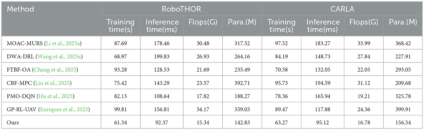 As shown in Table 3, the resource consumption and efficiency comparison experiments reveal that the proposed method not only outperforms other methods in performance metrics but also exhibits significant advantages in computational efficiency, model size, and inference speed, fully demonstrating the model's lightweight design and deployment friendliness. On RoboTHOR, the proposed method achieves the shortest training time (61.34 s), over 38% faster than the slowest (Enriquez et al., 99.81 s), indicating higher efficiency in parameter updates. The inference time per step averages only 92.37 milliseconds, notably lower than Wang et al. (199.83 ms) and Li et al. (178.46 ms), favoring real-time robot responses in practical applications. In terms of computational complexity, the proposed method requires only 15.34 GFLOPs, the lowest among all methods (compared to Enriquez et al. 34.17 G, Li et al. 30.48 G), confirming its deployability on resource-constrained platforms. Furthermore, the model's parameter count is only 142.83 M, the smallest among all methods, reflecting highly optimized network design. On the more complex CARLA dataset, the proposed method maintains its lead, with a training time of 63.27 s, over 15% shorter than most other comparison methods. The inference time averages just 95.12 milliseconds, much faster than Wang et al. (148.73 ms), Li et al. (183.27 ms), and Liu et al. (194.59 ms). In terms of computational complexity, the model requires only 16.78 GFLOPs, significantly lower than Li et al. (33.99 G) and Liu et al. (31.12 G). The parameter count remains the lowest at 156.34 M, verifying the model's balanced design in ensuring performance while minimizing computational overhead.