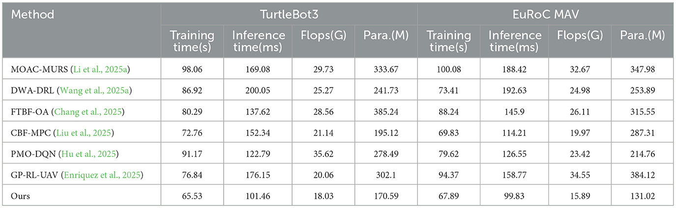 Overall, comprehensive analysis indicates that the proposed method leads not only in obstacle avoidance accuracy and path efficiency but also in model size, computational complexity, training convergence speed, and inference response time. It fully embodies the innovative concept of lightweight, efficient, and deployable model design. Especially in practical robotic applications, the proposed model's high efficiency, low latency, and low resource consumption characteristics provide a solid foundation for deployment on embedded platforms or resource-constrained systems, offering considerable practical value and broad promotion potential.