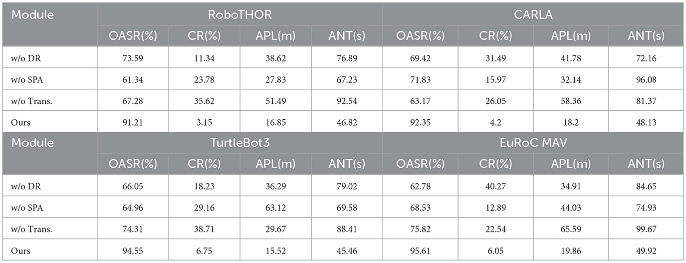 On RoboTHOR, the full model achieves an OASR of 91.21%, while removing the DR module drops it to 73.59%, and removing SPA further drops it to 61.34%, demonstrating the crucial role of reinforcement learning for long-term decision-making in dynamic environments and the SPA for feature representation and obstacle perception. Removing the Transformer causes OASR to decline to 67.28% and CR to surge to 35.62%, while APL increases dramatically to 51.49 meters, confirming the importance of Transformer in capturing global temporal dependencies. The full model's APL of 16.85 meters and ANT of 46.82 s remain optimal.