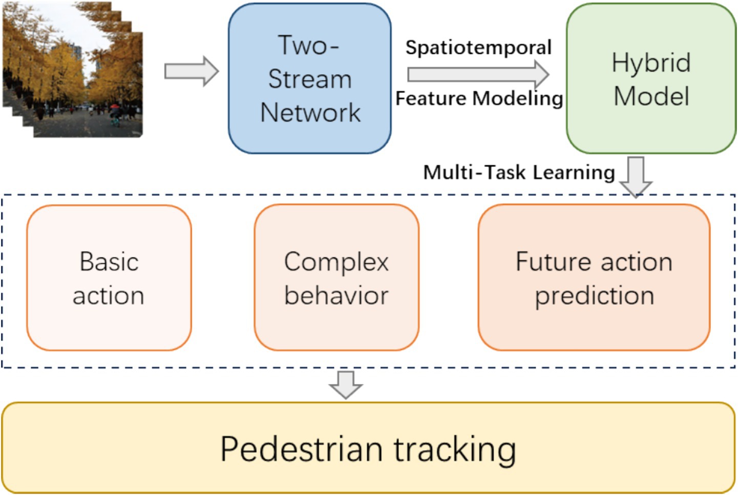 Despite the rapid advancements in pedestrian tracking and behavior recognition, several significant challenges remain. First, real-world video scenarios are highly complex, featuring crowded environments, frequent occlusions, diverse pedestrian appearances, varying lighting conditions, and dynamic backgrounds. These factors severely limit the performance of conventional methods relying on handcrafted features or single-stream networks. Although Two-Stream CNNs have demonstrated effectiveness in capturing spatial and motion information separately, they still struggle to model long-term temporal dependencies and complex high-level behaviors. Moreover, traditional single-task models often fail to address multiple objectives simultaneously, such as recognizing both basic actions and complex social behaviors, or anticipating future actions based on historical context (Figure 1).