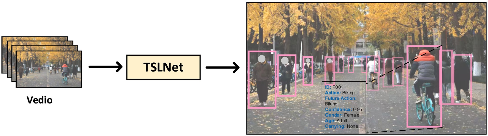 In addition to public datasets, we constructed a self-built dataset to further validate the effectiveness of TSLNet in specific application scenarios. The construction process of the self-built dataset involves three main steps: data collection, annotation, and preprocessing. During the data collection phase, high-definition cameras were deployed in various public locations such as shopping malls, train stations, and streets to capture video data, ensuring diversity and coverage of different behavior patterns and scene variations. Approximately 50 h of video data were collected, encompassing over 1,000 pedestrian samples. In the annotation phase, the VGG Image Annotator (VIA) tool was utilized for manual frame-by-frame annotation, defining a multi-level behavior categorization scheme that includes basic actions (e.g., walking, running, stopping, biking) complex behaviors (e.g., making phone calls, carrying objects, conversing), and future action prediction categories (e.g., movement direction prediction, imminent actions).