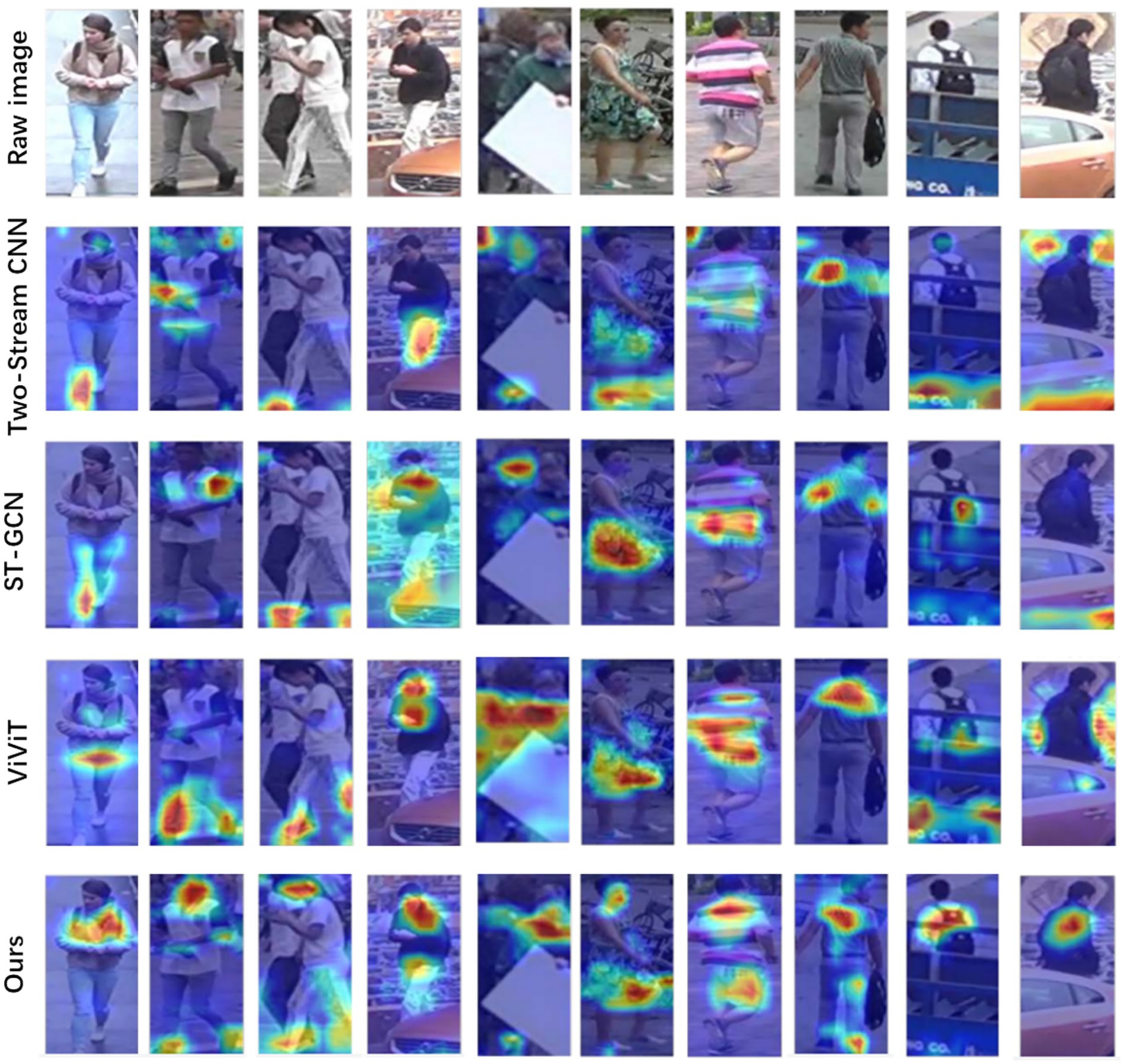 To further observe the performance of the proposed TSLNet, we quantified the attention weight distribution in key regions. On the testing set, the average attention weight in pedestrian head regions reaches 0.71, indicating that the model consistently focuses on the most behavior-relevant areas. For ease of comparison, we compare our method with three representative models, including our benchmark Two-Stream CNN (0.55) and the high-performing baselines ST-GCN (0.61) and ViViT (0.66). The corresponding attention patterns are presented in Figure 5, showing that TSLNet allocates significantly higher attention to head and torso regions, highlighting its stronger ability to capture critical visual cues for accurate behavior recognition and trajectory prediction.