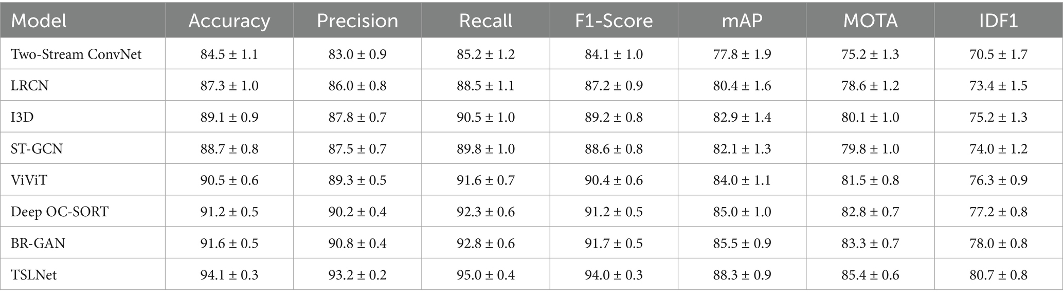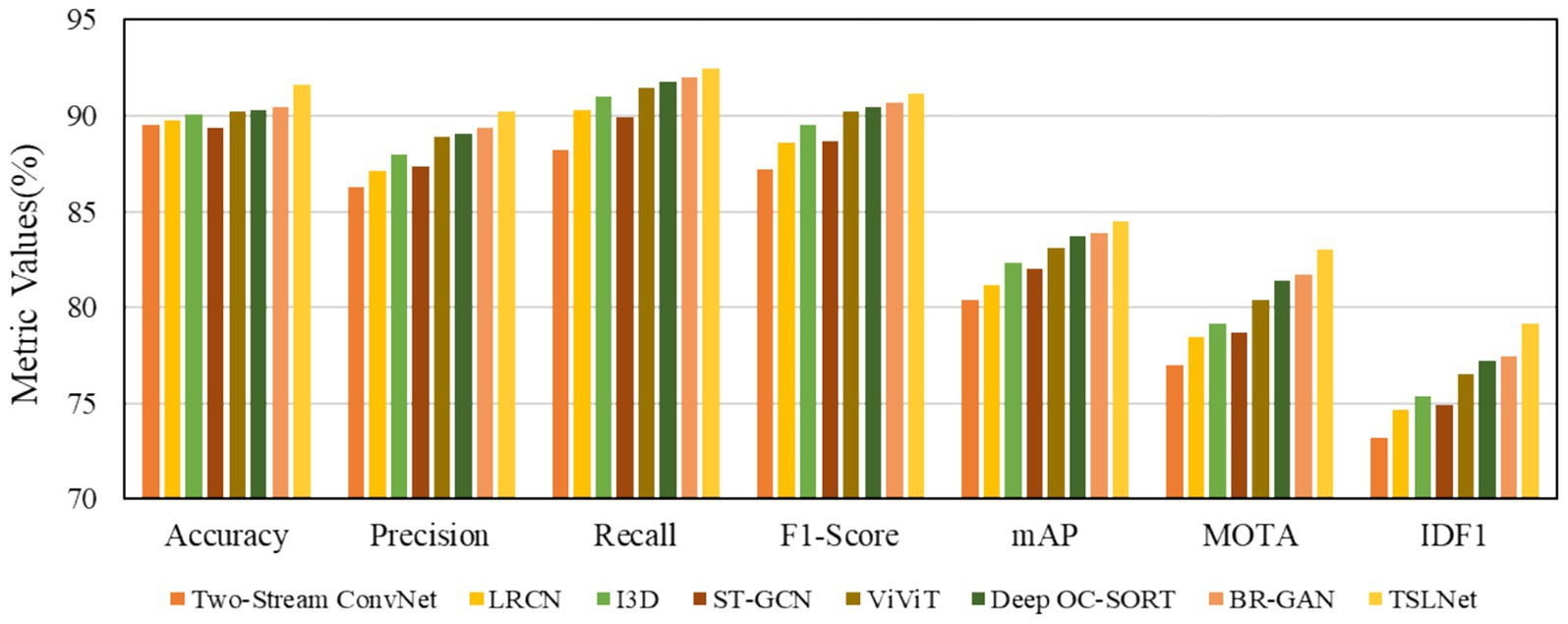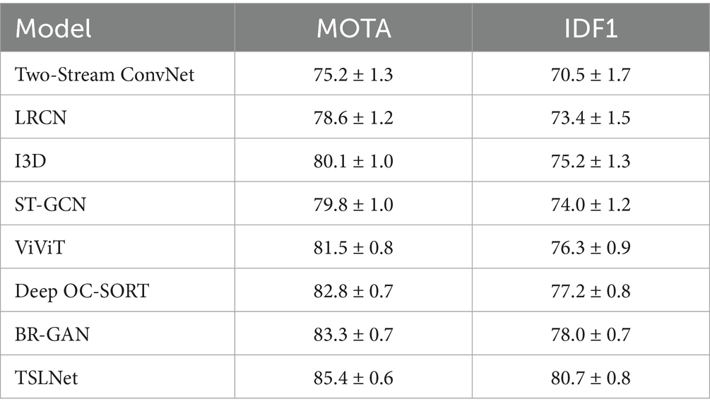 The selected models for comparison include Two-Stream ConvNet, LRCN, I3D, ST-GCN, ViViT, Deep OC-SORT, BR-GAN, and TSLNet. As shown in Figure 6, the results demonstrate that TSLNet consistently outperforms the other models, especially in scenarios with occlusions and varying lighting. This reflects the model’s robustness in handling such environmental challenges. The TSLNet model maintains higher accuracy and better overall tracking performance, showing improved MOTA and IDF1 scores compared to the other baseline models.
