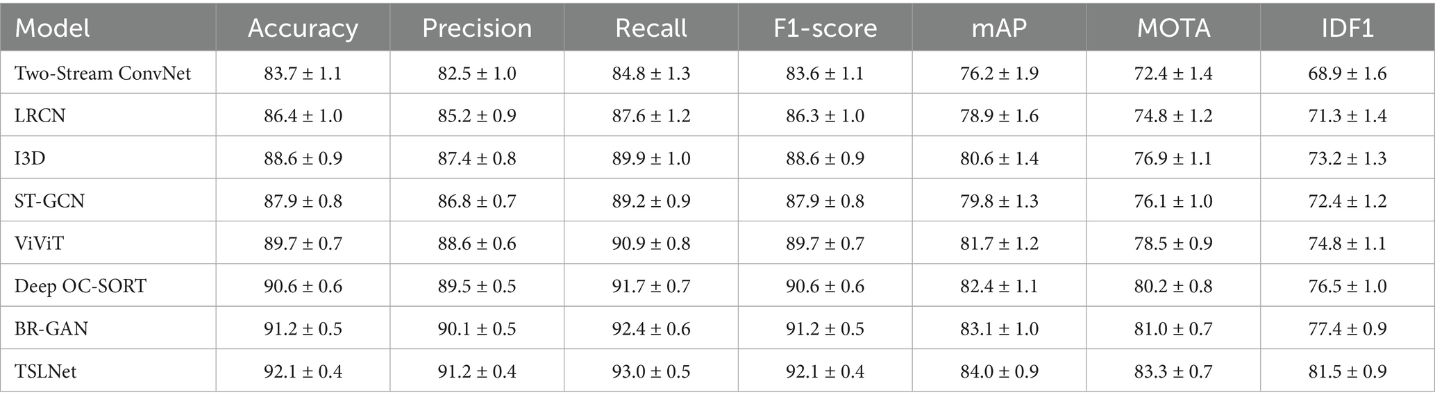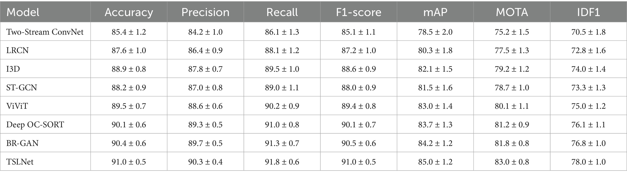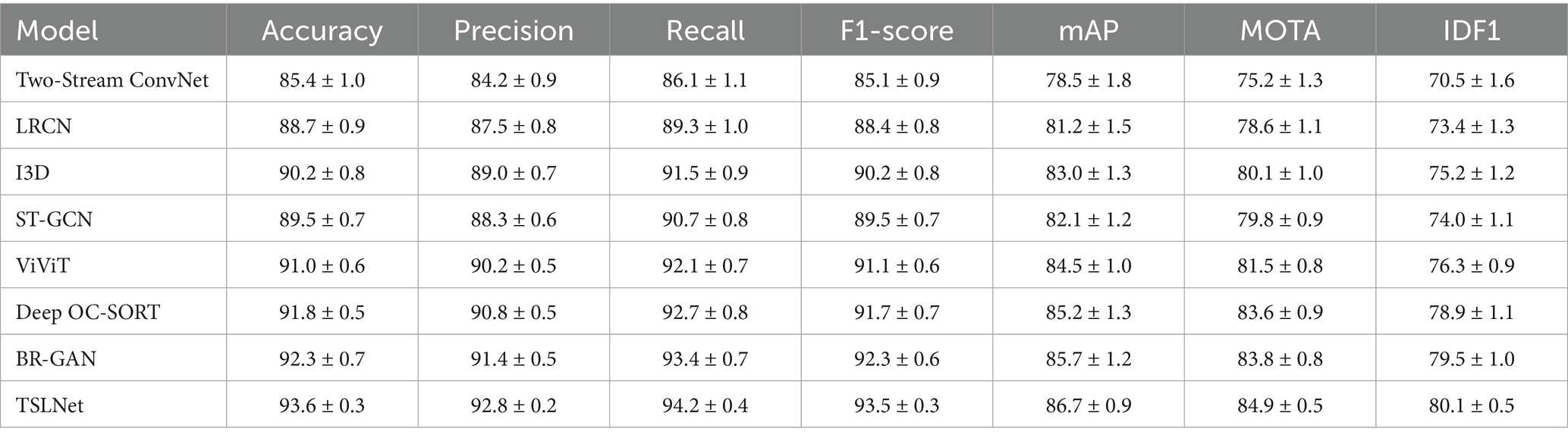 The selected models for comparison include Two-Stream ConvNet, LRCN, I3D, ST-GCN, ViViT, Deep OC-SORT, BR-GAN, and TSLNet. As shown in Figure 6, the results demonstrate that TSLNet consistently outperforms the other models, especially in scenarios with occlusions and varying lighting. This reflects the model’s robustness in handling such environmental challenges. The TSLNet model maintains higher accuracy and better overall tracking performance, showing improved MOTA and IDF1 scores compared to the other baseline models.