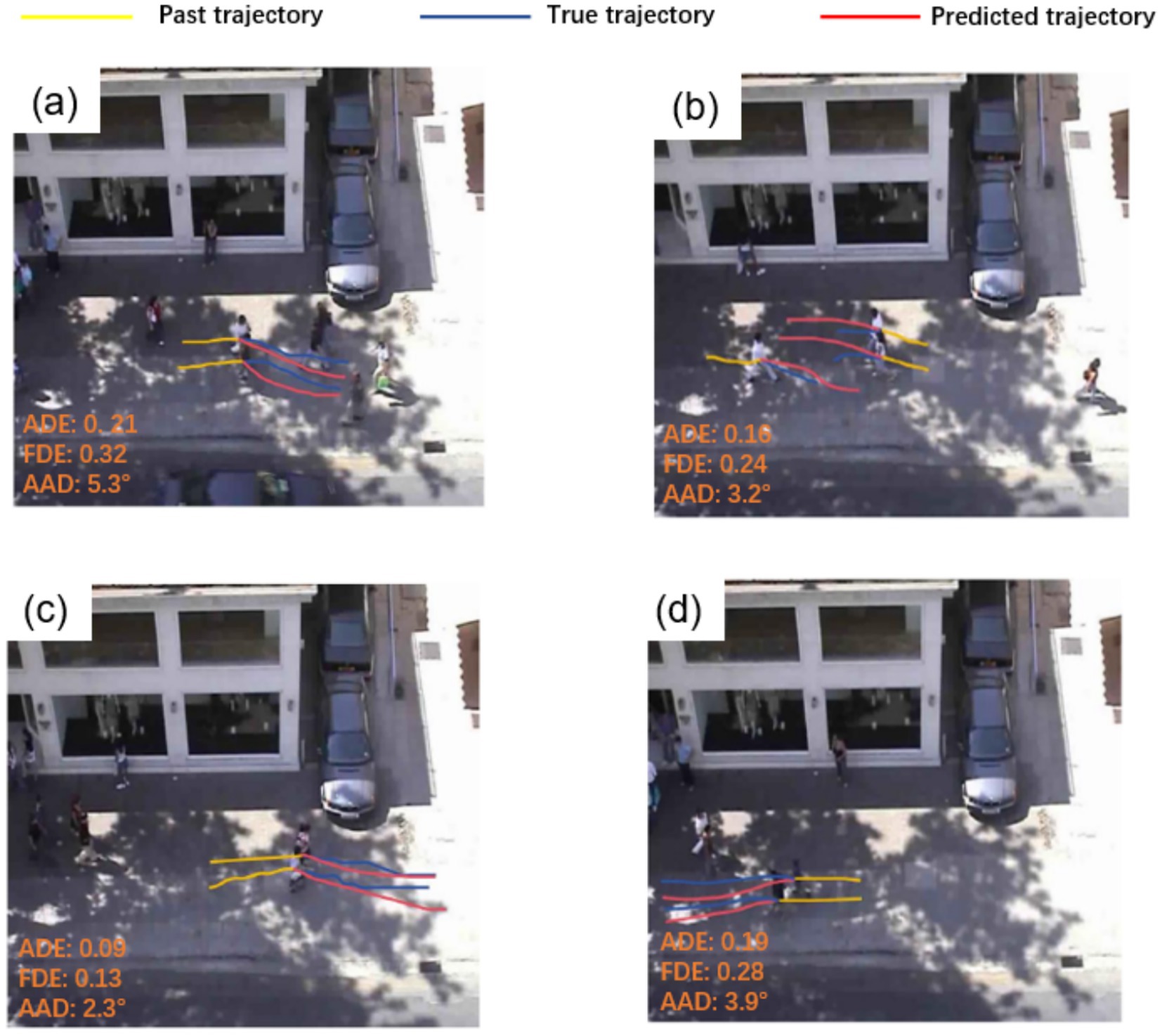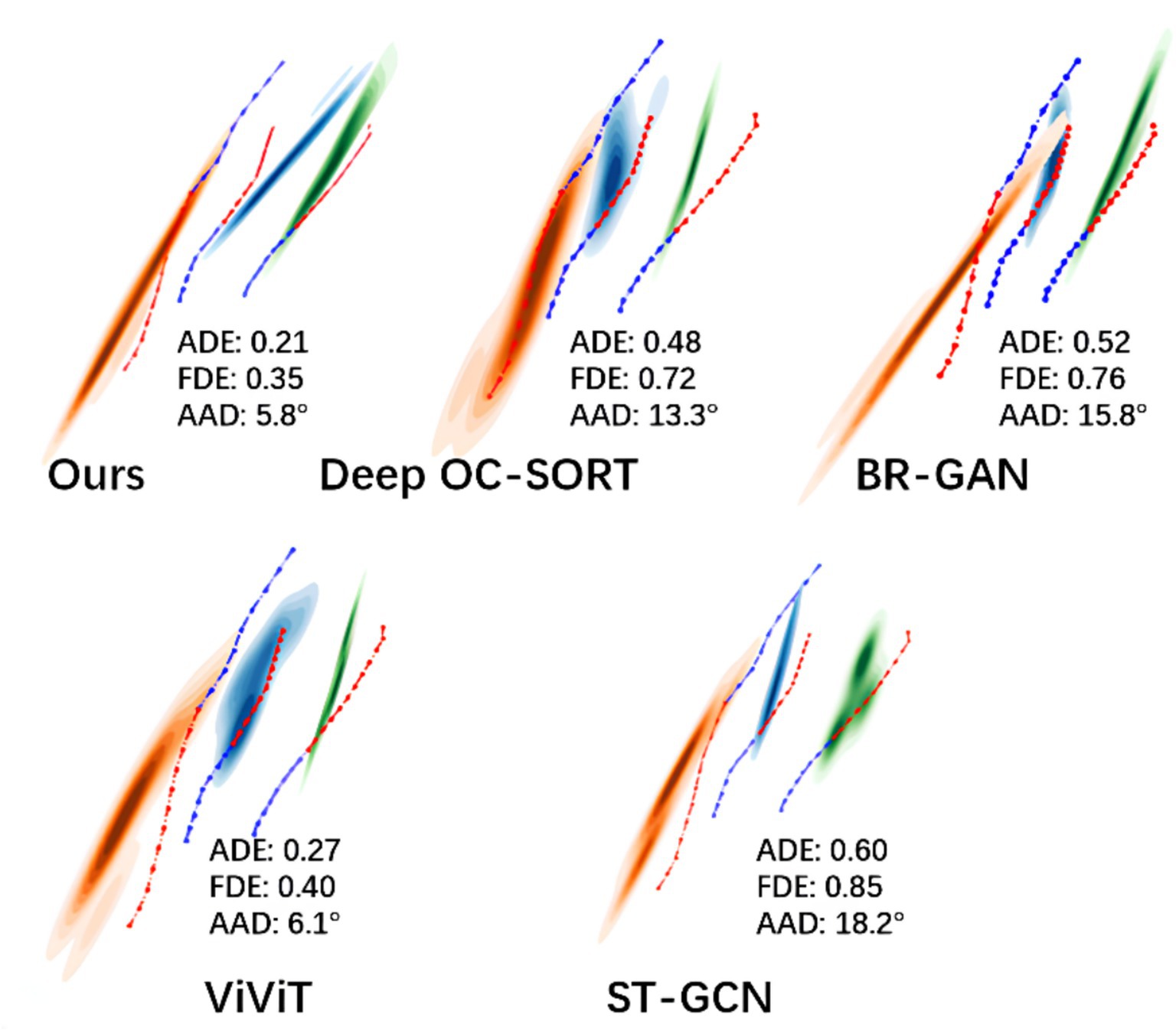 Figure 10 presents the predicted pedestrian trajectories in a relatively complex encounter scenario, where individuals meet from opposite directions while walking side by side. Distinct colored regions denote the future trajectory distributions of different pedestrians, the blue dashed line corresponds to the observed history, and the red dashed line represents the ground truth. In this situation, pedestrians are expected to exhibit avoidance behavior to reduce collision risks. In addition to these visualizations, we report quantitative metrics including ADE, FDE and AAD for all models. The results show that TSLNet achieves the lowest ADE and the smallest average avoidance angle deviation, closely followed by ViViT, whereas other models exhibit substantially larger errors. These quantitative results, together with the visualizations, confirm that only TSLNet and ViViT effectively capture realistic avoidance behavior, demonstrating the robustness of TSLNet under challenging interactive scenarios.