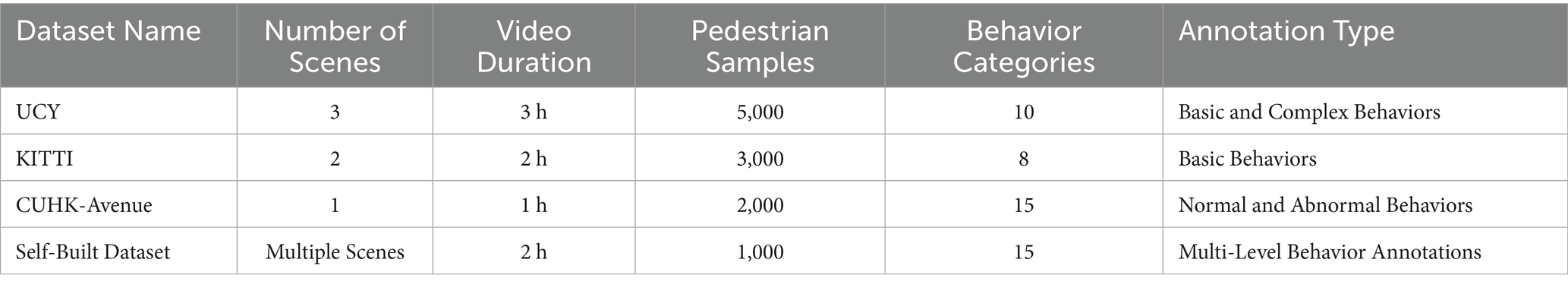 To comprehensively evaluate the performance of the proposed TSLNet model, we conducted experiments on multiple public datasets as well as a self-built dataset. Initially, we selected several widely-used public datasets for pedestrian behavior recognition, including the UCY Dataset, KITTI Dataset, and CUHK-Avenue Dataset.
