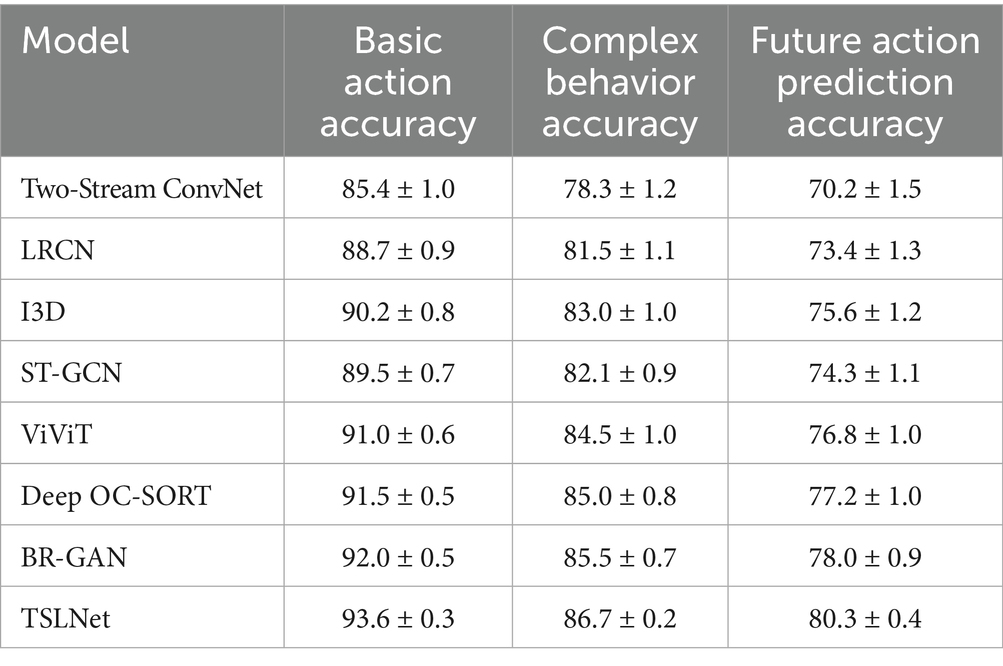 We compared TSLNet against the aforementioned baseline models using the same datasets and evaluation metrics to ensure a fair assessment. The tasks evaluated include pedestrian tracking and behavior recognition, with specific focus on basic action classification, complex behavior recognition, and future action prediction. The evaluation metrics employed are Accuracy, Precision, Recall, F1-Score, Mean Average Precision (mAP), Multiple Object Tracking Accuracy (MOTA), and ID F1 Score (IDF1).