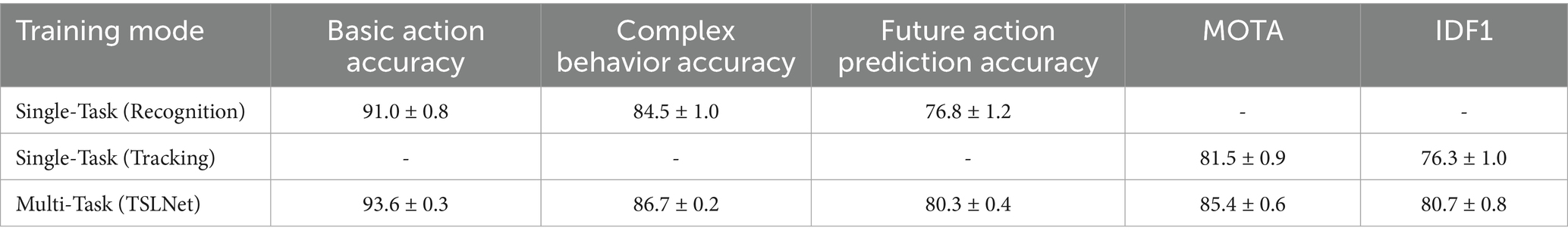 To evaluate the synergy between pedestrian tracking and behavior recognition, we compared the performance of multi-task training against single-task training. Multi-task training significantly enhances performance across all evaluation metrics compared to single-task training (Table 8). Specifically, TSLNet’s multi-task approach leads to improvements of approximately 2.6% in basic action accuracy, 2.2% in complex behavior accuracy, 3.5% in future action prediction accuracy, 4.3% in MOTA, and 4.4% in IDF1.