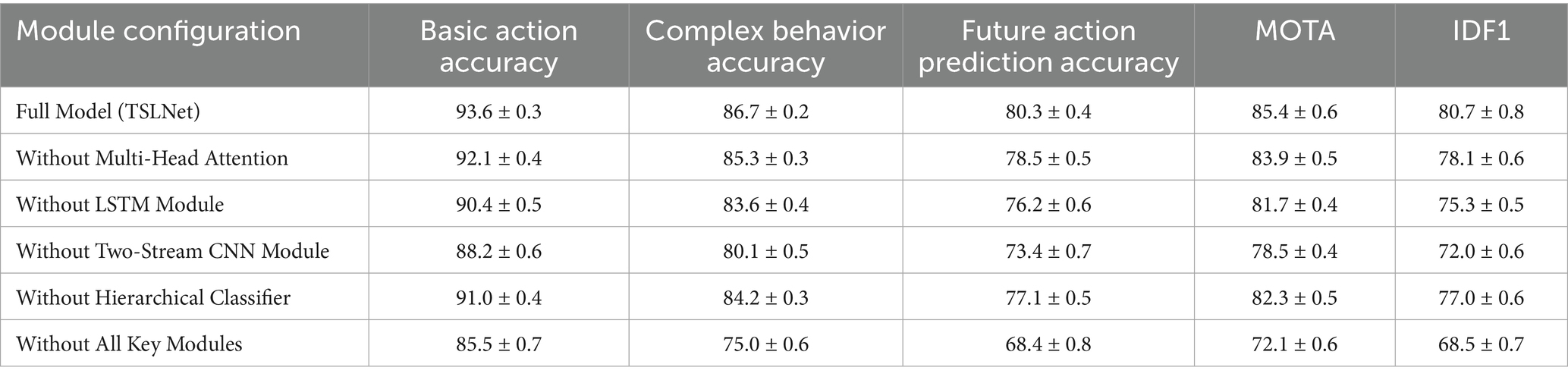 The results indicate that each component contributes significantly to the overall performance (see Table 9). Notably, removing the multi-head attention mechanism and the LSTM module leads to substantial declines in accuracy, precision, recall, F1-Score, mAP, MOTA, and IDF1 scores, highlighting their critical roles in enhancing model performance.