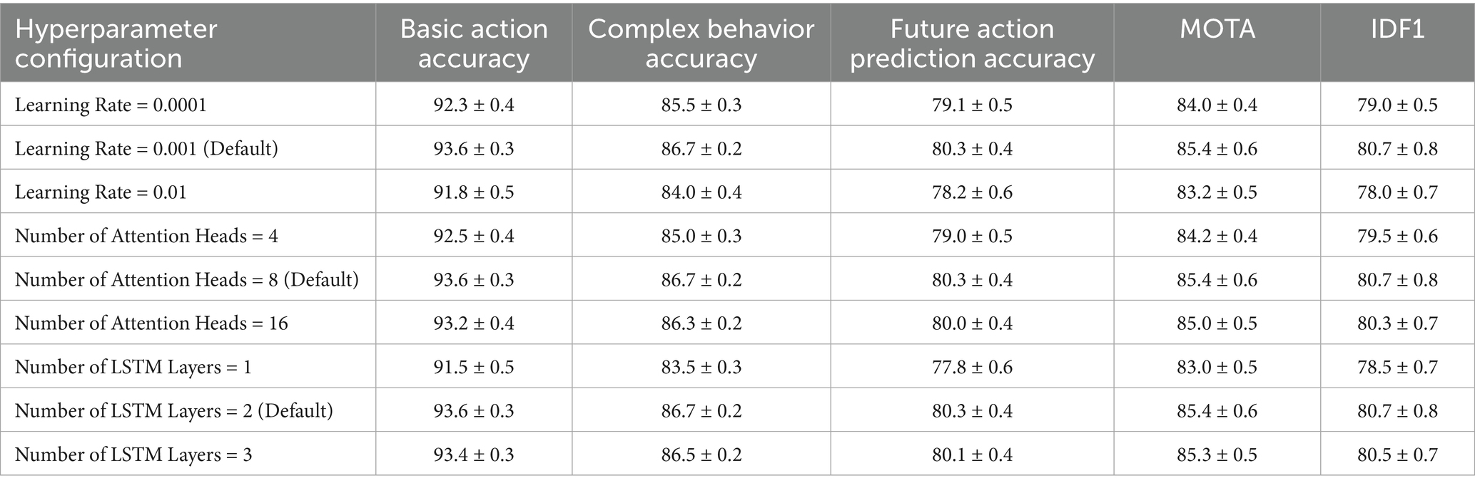 Where , , and are the cross-entropy losses for basic action classification, complex behavior classification, and future action prediction, respectively. , , and are weight coefficients used to balance the contributions of each task’s loss. To determine appropriate values for these weights, we conducted systematic ablation studies. Various combinations of , , and were tested on the validation set, evaluating the model’s performance on all three tasks. The final configuration was selected to provide the best trade-off, achieving balanced improvements across basic action accuracy, complex behavior recognition accuracy, and future action prediction accuracy.