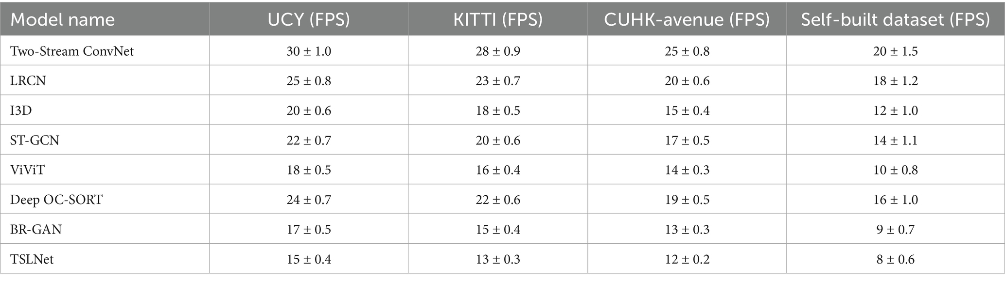Inference speed, measured in Frames Per Second (FPS), is crucial for real-time applications. TSLNet exhibits a slightly lower FPS compared to baseline models, which is a trade-off for its enhanced accuracy and recognition capabilities. Table 12 shows that TSLNet has a lower inference speed compared to baseline models across all datasets, with FPS values decreasing from 30 ± 1.0 (Two-Stream ConvNet) to 15 ± 0.4 (TSLNet) on the UCY dataset, and similarly across other datasets. While TSLNet sacrifices some speed, its superior accuracy and recognition performance make it highly suitable for applications where precision is paramount.