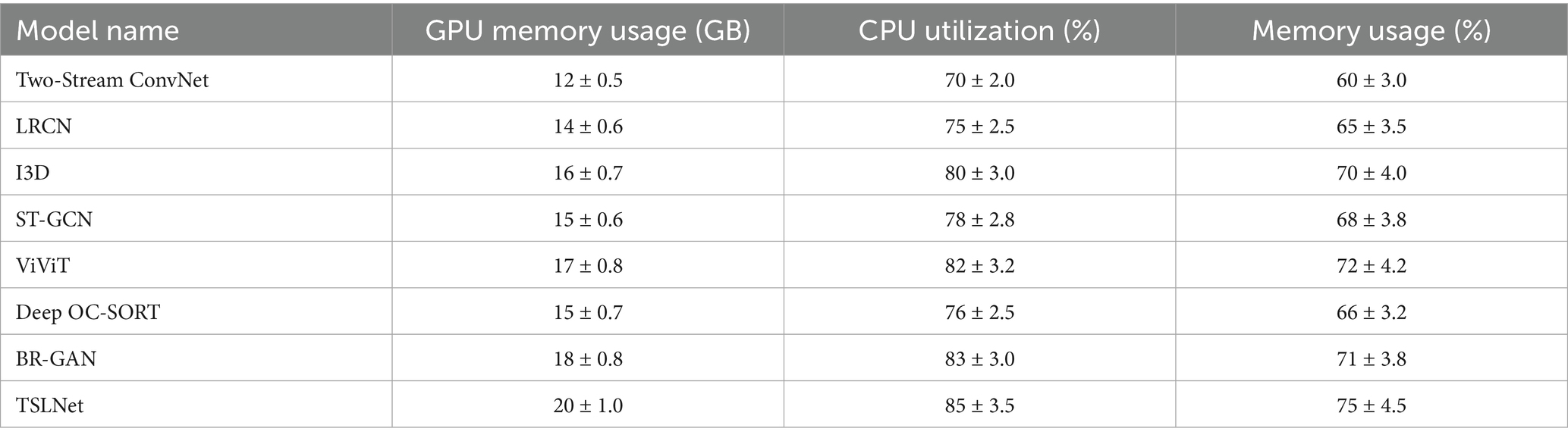 As illustrated in Table 13, TSLNet consumes more GPU memory, CPU utilization, and overall memory compared to baseline models. Specifically, TSLNet requires 20 ± 1.0 GB of GPU memory, 85 ± 3.5% CPU utilization, and 75 ± 4.5% memory usage, reflecting its intricate architecture and multi-task learning framework. Despite the higher resource demands, modern high-performance computing platforms can accommodate these requirements. Future work may explore optimization techniques such as model compression, knowledge distillation, or quantization to reduce resource consumption without compromising performance.