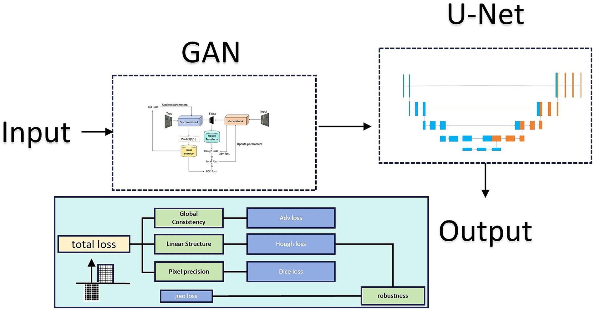 Figure 1. Architecture of the proposed UHGAN framework compared with a standard U-Net. UHGAN adopts a dual-stage design: Stage 1 employs a GAN generator with adversarial, segmentation, Hough-transform, and geometric consistency losses to capture global road structures, while Stage 2 uses a refinement U-Net to repair discontinuities and suppress noise. This joint training strategy ensures both spatial structural consistency and high prediction accuracy.