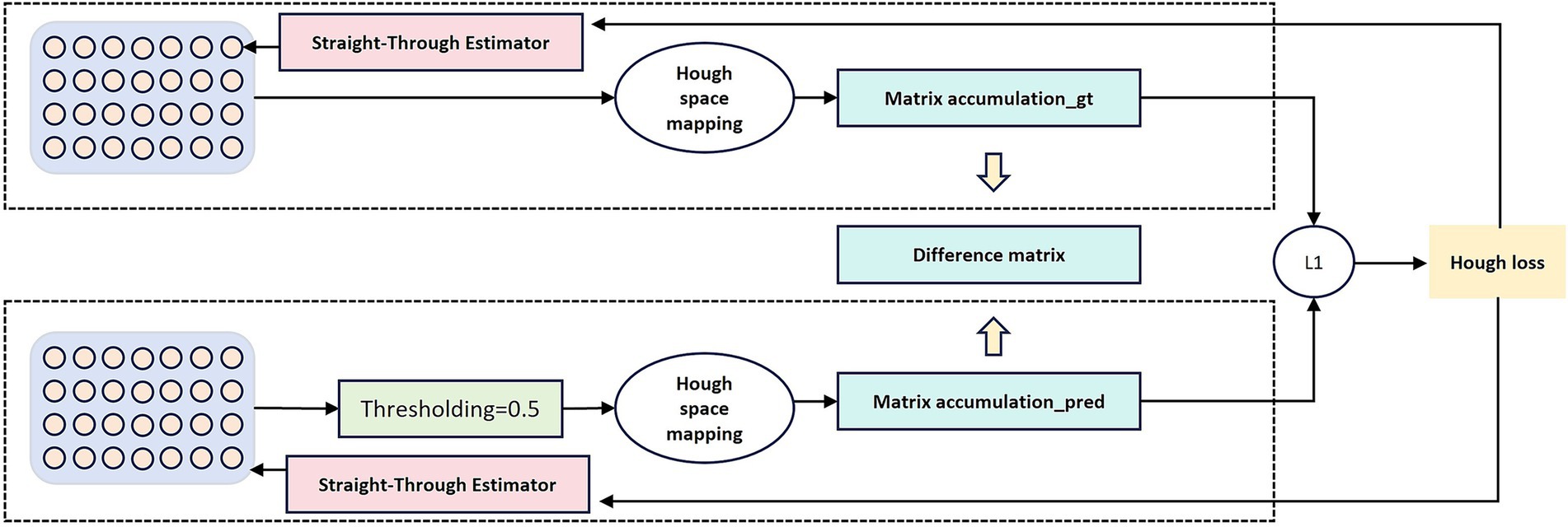 Figure 2. Illustration of the differentiable Hough-transform loss. Input features are projected into the Hough parameter space, where vote accumulation matrices are computed for both the ground truth mask and the predicted mask. The L1-norm difference between these matrices forms the Hough loss, which enforces linear and curvilinear structural consistency during training.