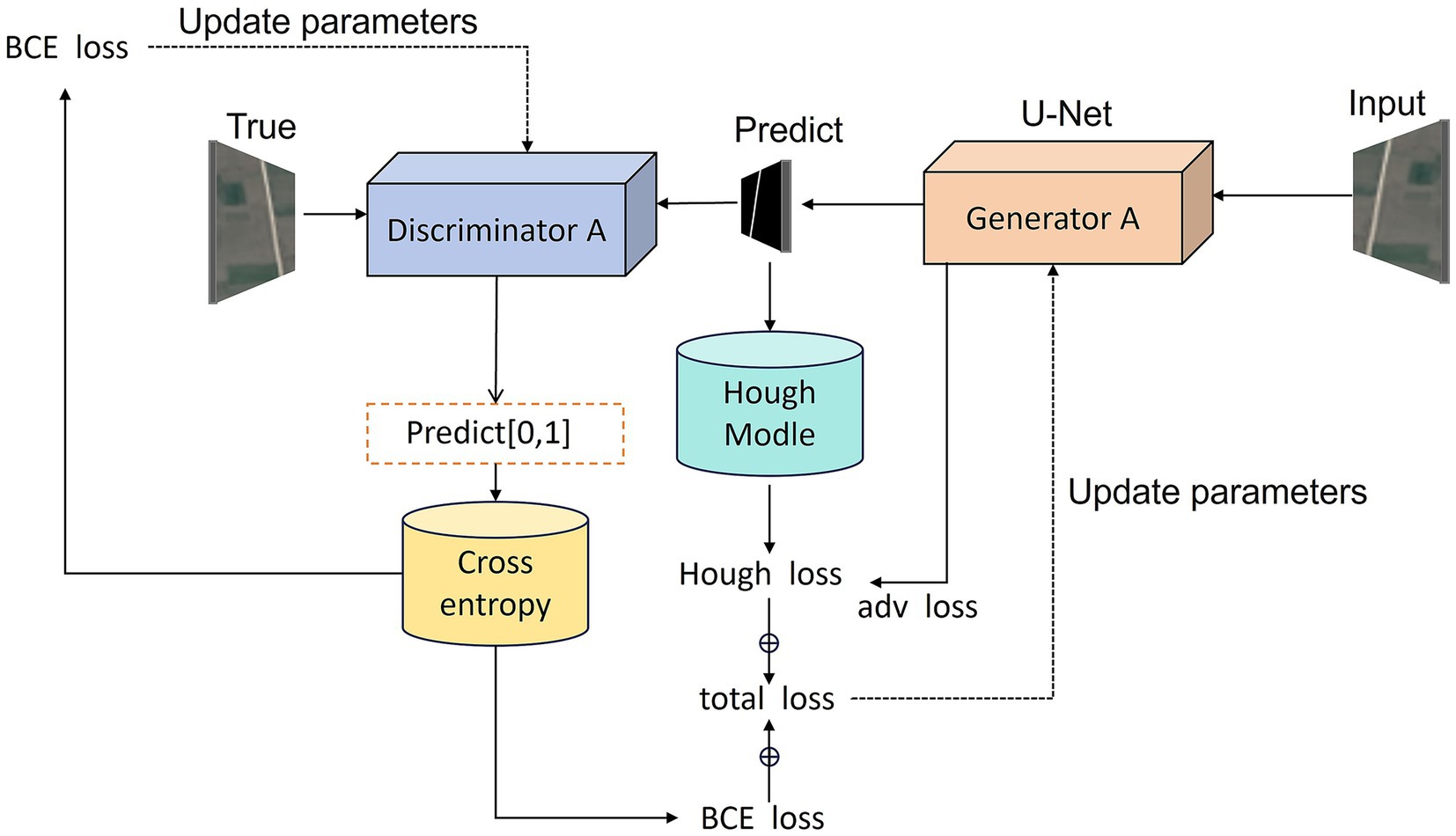In our model, the Hough transform loss is combined with other loss functions, utilizing the complementary properties of different loss functions (Figure 2). Adversarial loss causes the generated road to appear realistic, serving as an implicit representation of the Hough transform in the discriminator network. This loss captures the geometric characteristics of the road through adversarial learning mechanisms. The discriminator network naturally develops sensitivity to linear features during the learning process, which is highly consistent with the line detection principle of the Hough transform. Specifically, when distinguishing between real roads and generated roads, the discriminator automatically learns to recognize typical geometric patterns of roads, such as straight lines, parallel lines, and regular intersections, which are precisely the features that the Hough transform focuses on.