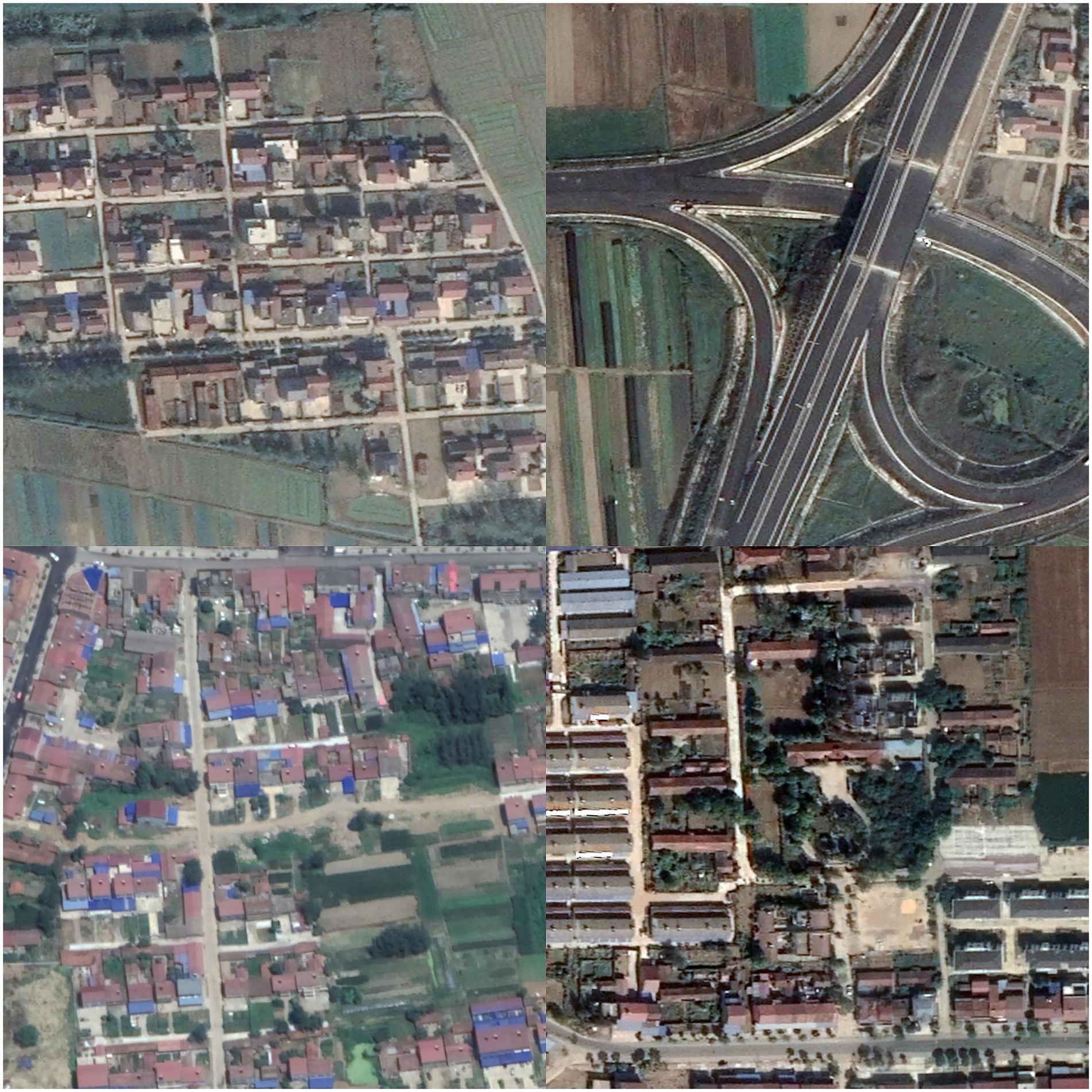 To address the specific requirements and computational constraints of extracting roads in high-standard farmland, a targeted data selection strategy was applied to the WHU RuR + dataset. Although the dataset is large-scale (containing 27,770 images in total), a significant portion of the images include irrelevant objects such as houses, building complexes, and urban roads, as shown in Figure 5, which are not characteristic of farmland environments. Some images also suffer from severe occlusions or non-road interference, making them unsuitable for representing the road morphology and background features in “high-standard farmland” scenarios. Therefore, instead of using the entire dataset, we manually selected 120 images with typical farmland road characteristics, minimal occlusion, and high label quality for training, along with another 80 images for testing.