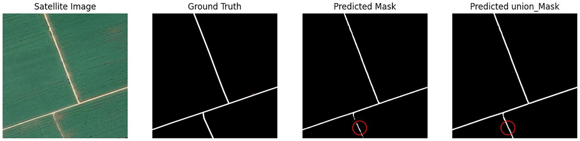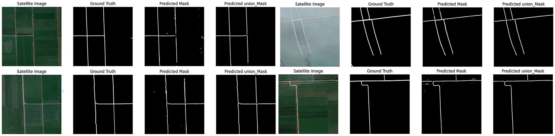 Discussion: The results demonstrate that our approach effectively mitigates the issues of discontinuous extraction caused by the complex geometric shapes and partial occlusion characteristic of farmland roads. The integration of Hough-transform loss, an technique that has received limited attention in prior studies, proves to be highly beneficial. This method shows considerable promise for practical applications in rural infrastructure planning and precision agriculture.
