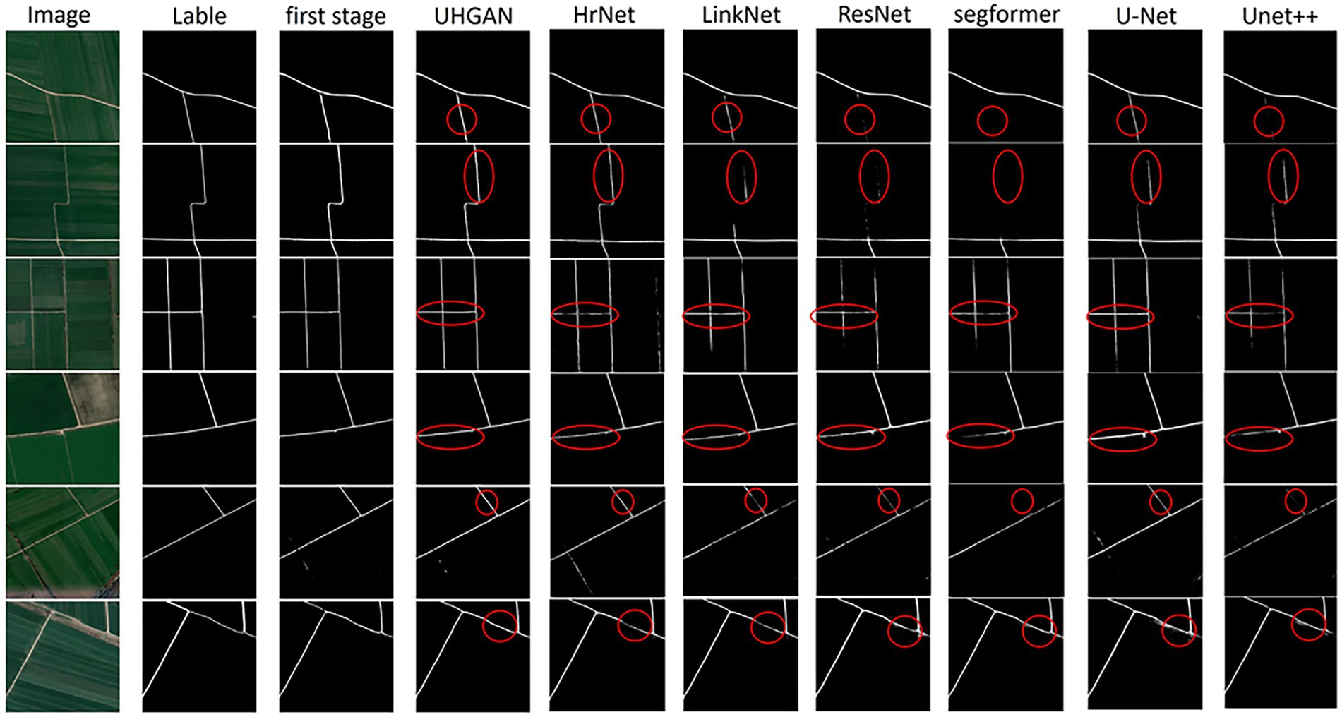 Introduction: Traditional methods for farmland road extraction, such as U-Net, often struggle with complex noise and geometric features, leading to discontinuous extraction and insufficient sensitivity. To address these limitations, this study proposes a novel dual-phase generative adversarial network (GAN) named UHGAN, which integrates Hough-transform constraints.