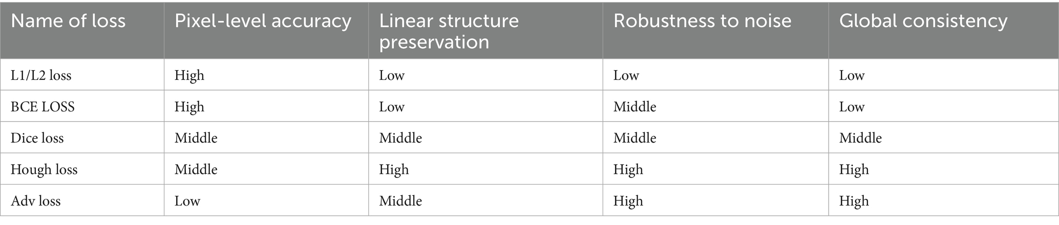 Unlike pixel-level losses such as L1 loss (Terven et al., 2025) and least squares loss (Wang et al., 2024), Hough transform loss operates in parameter space. This enables focus on linear structures with particular sensitivity to road-like features, effectively guiding models to learn geometric patterns. Simultaneously, it provides a global perspective that considers both local pixel accuracy and overall linear layout correctness. Through parameter space comparison, models generate more continuous and complete linear structures. Table 1 compares Hough transform loss advantages versus traditional losses for road extraction:
