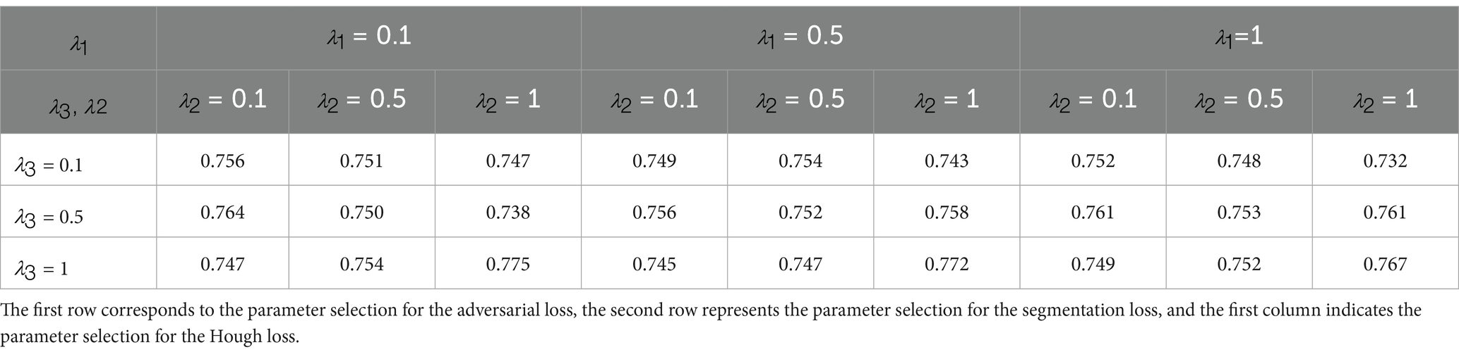 Therefore, we set to a small value (0.001), which preserves a certain degree of geometric smoothness without undermining the model’s ability to capture global topological structures. The remaining loss weights—including the adversarial loss , segmentation loss , and Hough loss —were tuned via grid search within the range {0.1, 0.5, 1}. This process yielded 27 experimental configurations in total, as illustrated in the Table 2. Finally, we selected , , and as {0.1, 0.1, 1}.