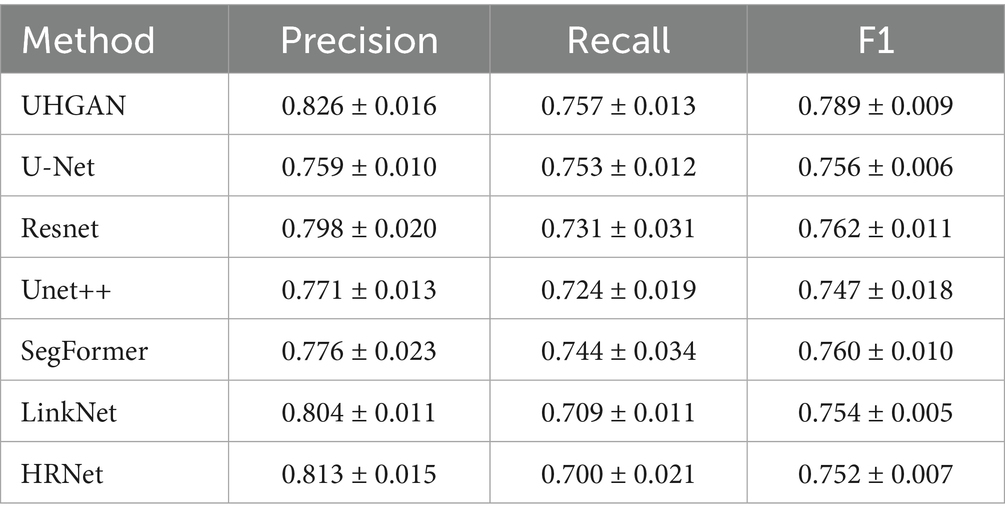 These metrics exhibit complementary characteristics: excessively high precision may reduce recall (over-conservatism), while high recall may compromise precision (over-aggression). The F1 score optimizes the balance between them, achieving high values only when both precision and recall are strong. To benchmark our model’s superiority, we conducted systematic comparisons against established models including U-Net, ResNet (Takahashi et al., 2022), UNet++ (Zhou et al., 2018), SegFormer (Xie et al., 2021), LinkNet (Chaurasia and Culurciello, 2017), and HRNet (Sun et al., 2019). Experiments strictly followed identical train/validation/test splits, preprocessing procedures, and evaluation metrics (Precision, Recall, F1 Score). Results are presented in Table 3: