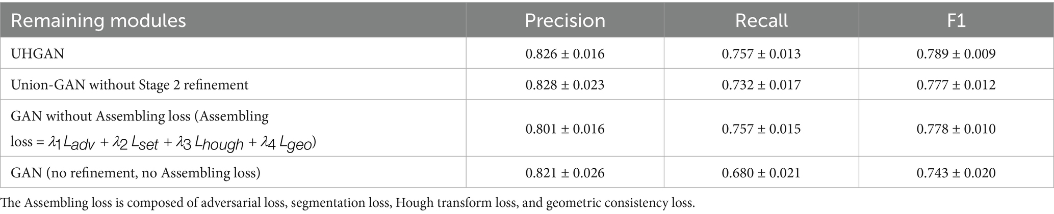 Our full model, UHGAN, which combines a Stage 1 GAN with Hough-transform Assembling loss (Assembling loss = ) and a Stage 2 refinement U-Net, achieves the best overall balance, with a precision of 0.826, recall of 0.757, and F1-score of 0.789. Removing the Stage 2 refinement (Union-GAN without Stage 2 refinement) leads to a drop in recall to 0.732 and a slight decrease in F1-score to 0.777, highlighting the importance of the second-stage module in maintaining road continuity and eliminating isolated fragments. When the Hough-transform Assembling loss is removed while retaining the Stage 2 refinement [GAN without Assembling loss (Assembling loss = )], the model achieves a precision of 0.801 ± 0.016 and a recall of 0.757 ± 0.015, resulting in an F1-score of 0.778 ± 0.010. Compared with UHGAN, the slightly lower F1-score indicates that the Assembling loss plays a critical role in capturing global structural information and maintaining balanced performance, preventing the model from overfitting to local features. The simplest baseline, which omits both the refinement stage and the Assembling loss (GAN (no refinement, no Assembling loss)), shows the most severe precision–recall imbalance, with recall dropping to 0.680 and F1-score sharply decreasing to 0.743, confirming that neither component alone is sufficient for robust performance. Overall, these ablation results demonstrate the complementary effects of the two design choices: the Stage 1 GAN with Assembling loss enforces global geometric consistency, while the Stage 2 refinement U-Net repairs discontinuities and suppresses noise, together enabling coherent and continuous road extraction with superior structural integrity (Equation 12).