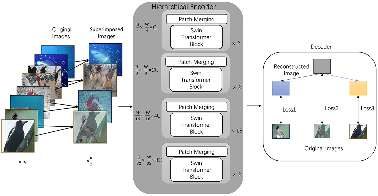 The input superimposed image with a size of 224 × 224 is first subjected to simple data enhancement (e.g., random cropping, horizontal flipping) and normalization. The encoder part is initialized with Swin Transformer (Liu et al., 2021) and a self-supervised pre-training strategy based on MAE (He et al., 2022). Specifically, we randomly mask 75% of the image patches and use a lightweight decoder with an embedding dimension of 512. The decoder takes as input the visible patch representations and masking tokens output by the encoder and appends them to the final stage of the encoder, which is used to learn the feature representations of the masked patches. Subsequently, the decoder predicts the normalized pixel values of the masked patches through a linear layer and splits the output of the superimposed image into two predicted images in ratio 1/2.